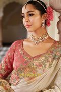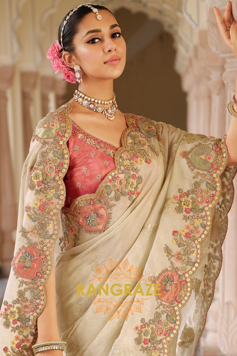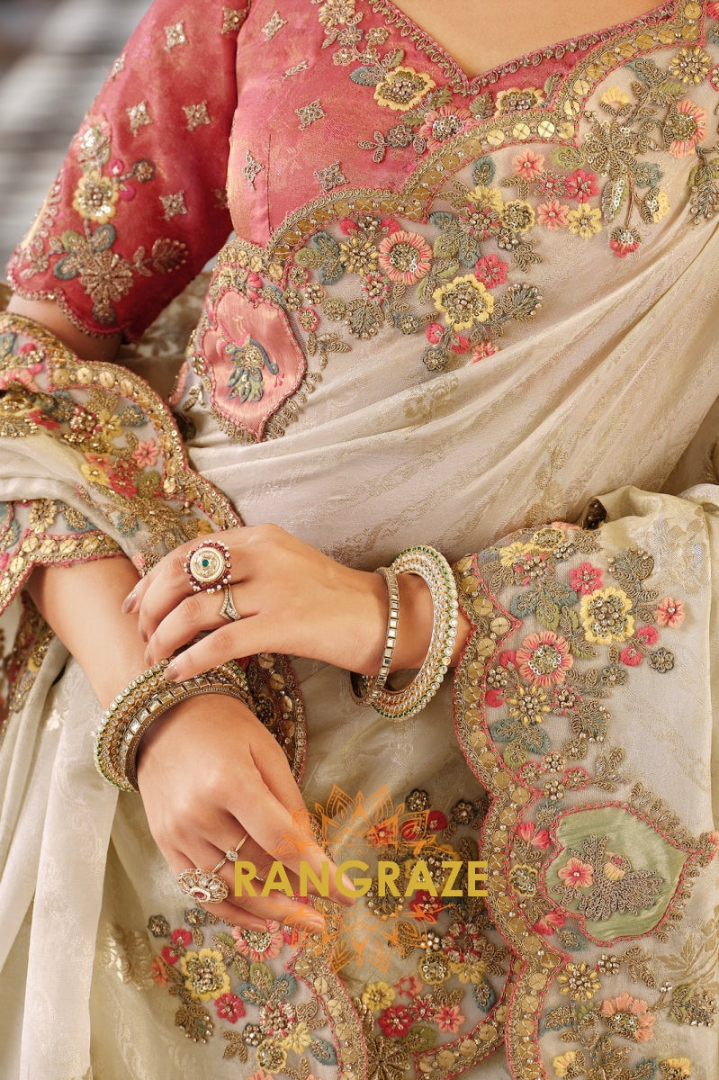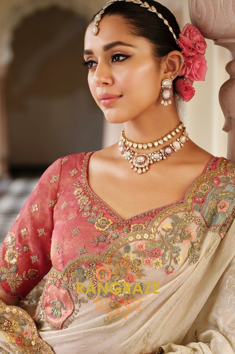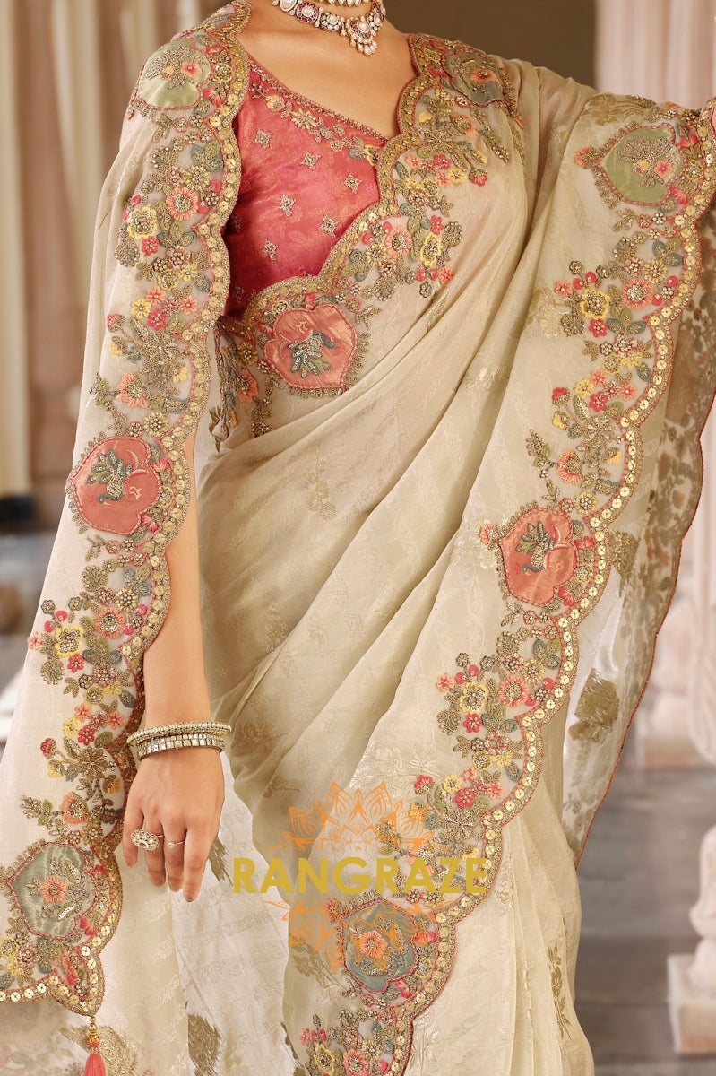 The scalloped border, featuring finely detailed motifs and tassel accents, blends traditional craftsmanship with modern finesse. Paired with a deep rose-pink embroidered blouse, this saree strikes the perfect balance of romance and regality, making it an exquisite choice for weddings, receptions, and festive soirées.