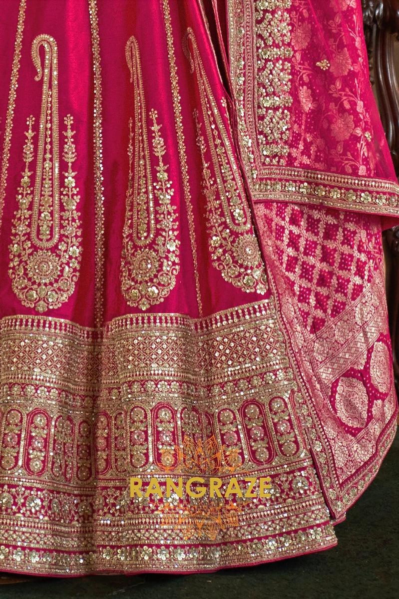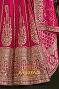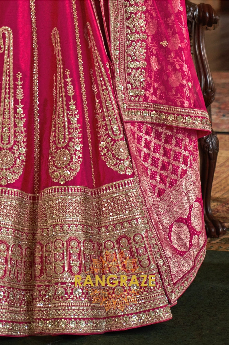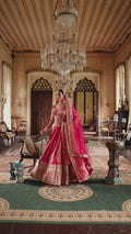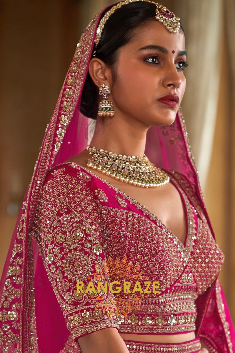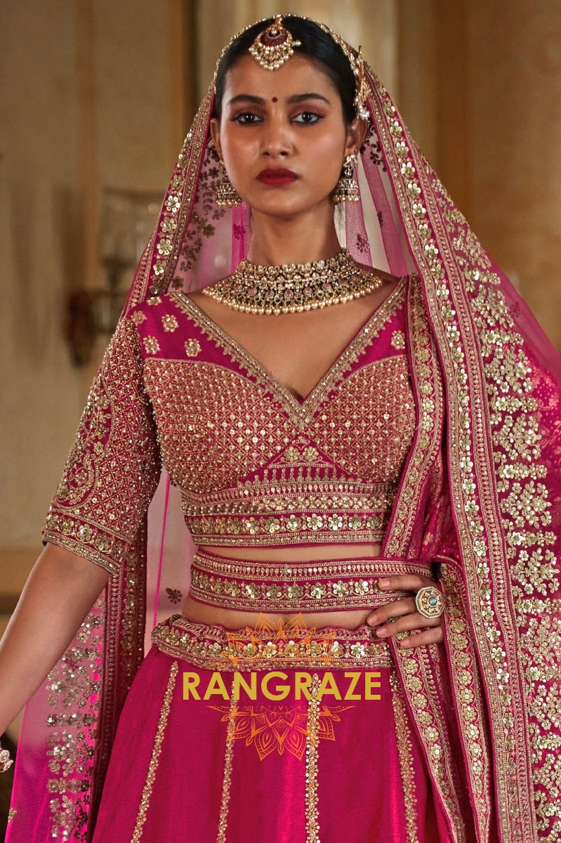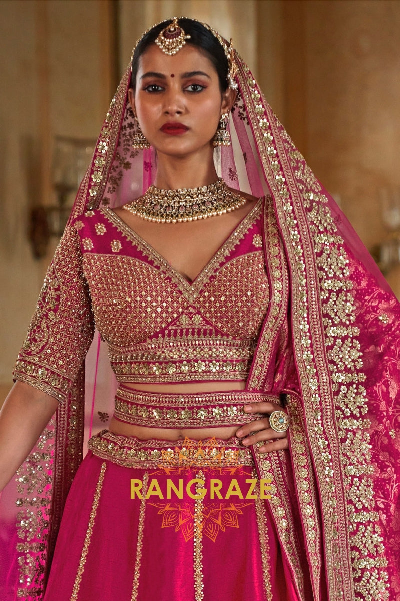 Step into radiant splendor with the Fuchsia Radiance Double-Dupatta Bridal Silk Lehenga, a breathtaking ensemble inspired by Sabyasachi’s signature blend of heritage and modern couture. With its vibrant fuchsia hue, intricate embroidery, and double-dupatta styling, this lehenga is designed for the bride who wishes to command the spotlight with timeless grace and contemporary vibrance.