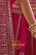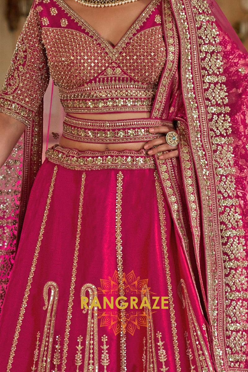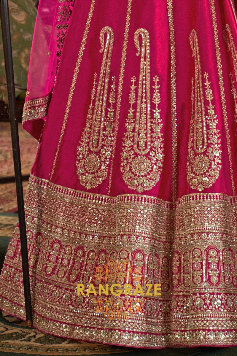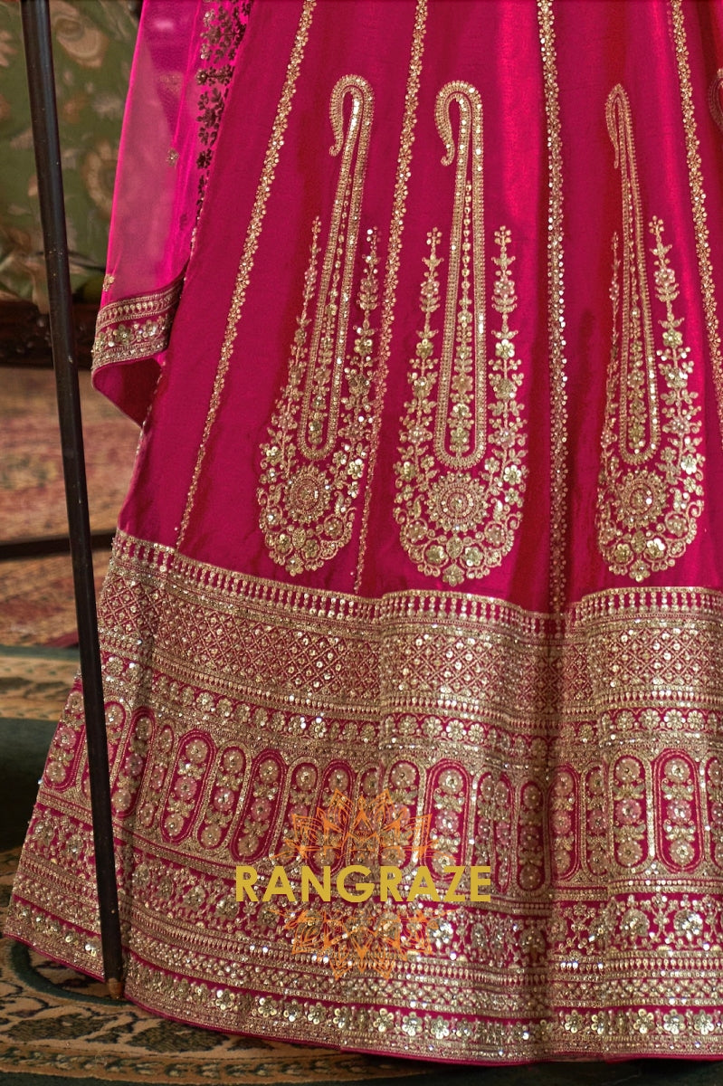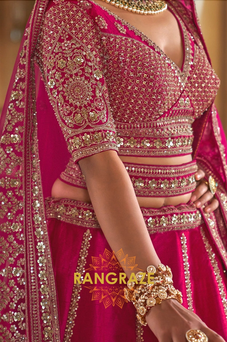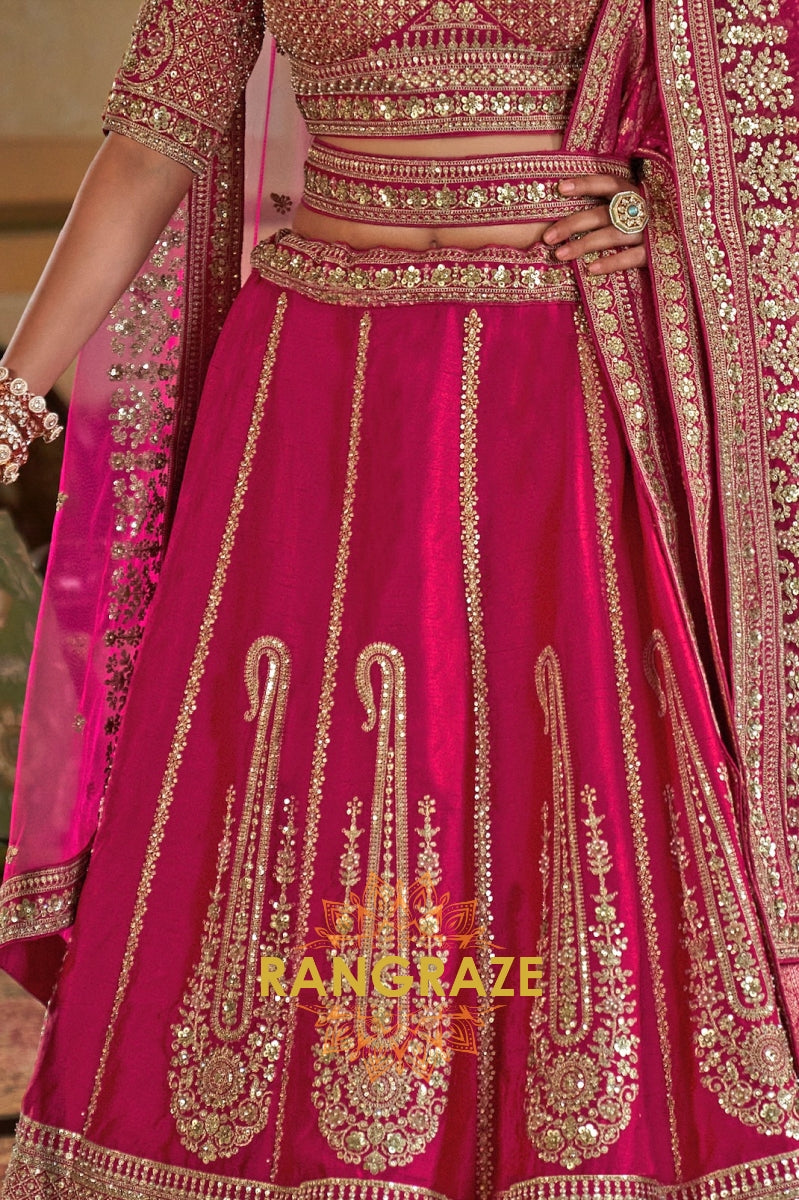 Step into radiant splendor with the Fuchsia Radiance Double-Dupatta Bridal Silk Lehenga, a breathtaking ensemble inspired by Sabyasachi’s signature blend of heritage and modern couture. With its vibrant fuchsia hue, intricate embroidery, and double-dupatta styling, this lehenga is designed for the bride who wishes to command the spotlight with timeless grace and contemporary vibrance.
