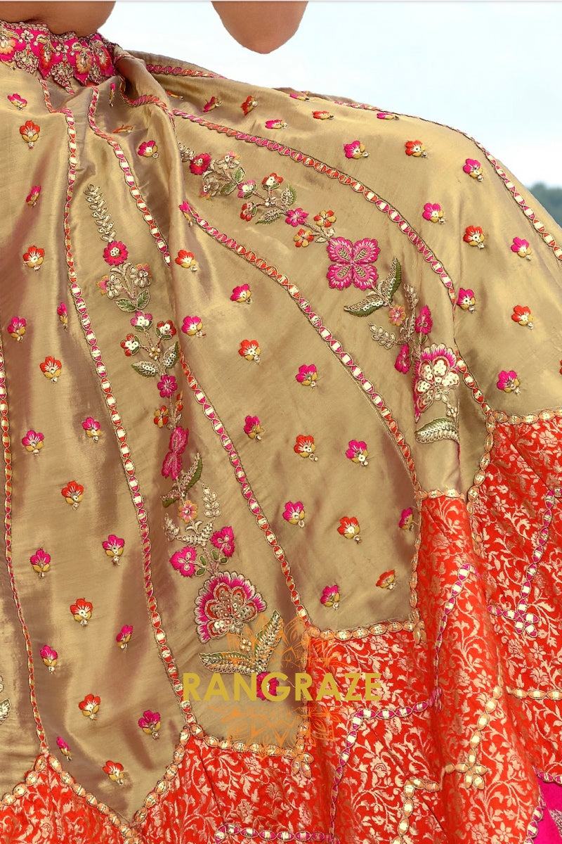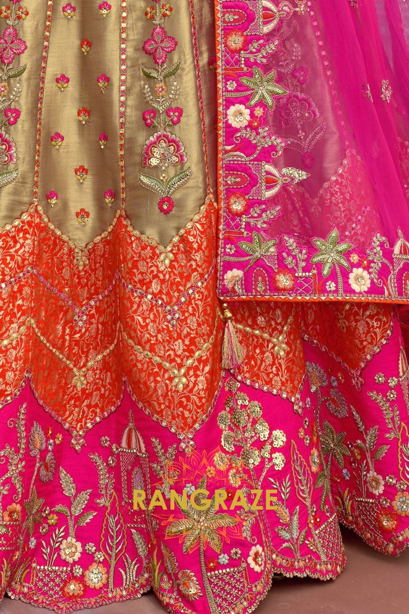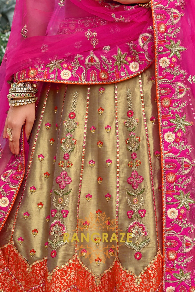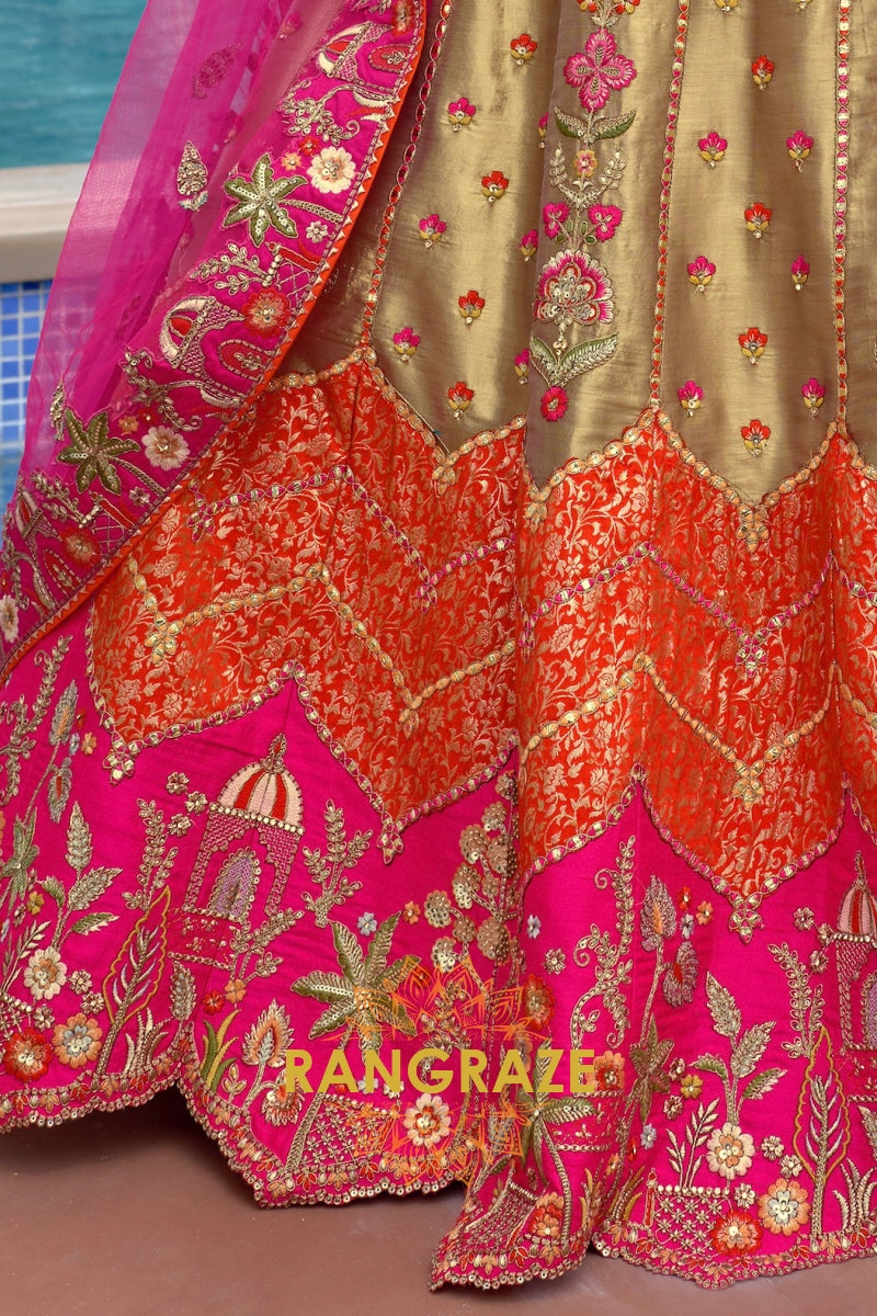 Designed in a luxurious combination of rich fuchsia pink, antique gold, and warm orange hues, the lehenga is adorned with elaborate heritage-inspired motifs, florals, and traditional elements. Fine embroidery using resham, zari, sequins, stone, and subtle mirror work enhances the visual richness of each panel. The heavily embroidered scalloped hem and expansive 4.2-meter ghera create a majestic silhouette with dramatic movement.