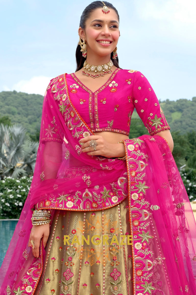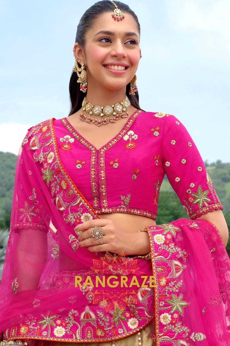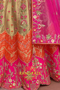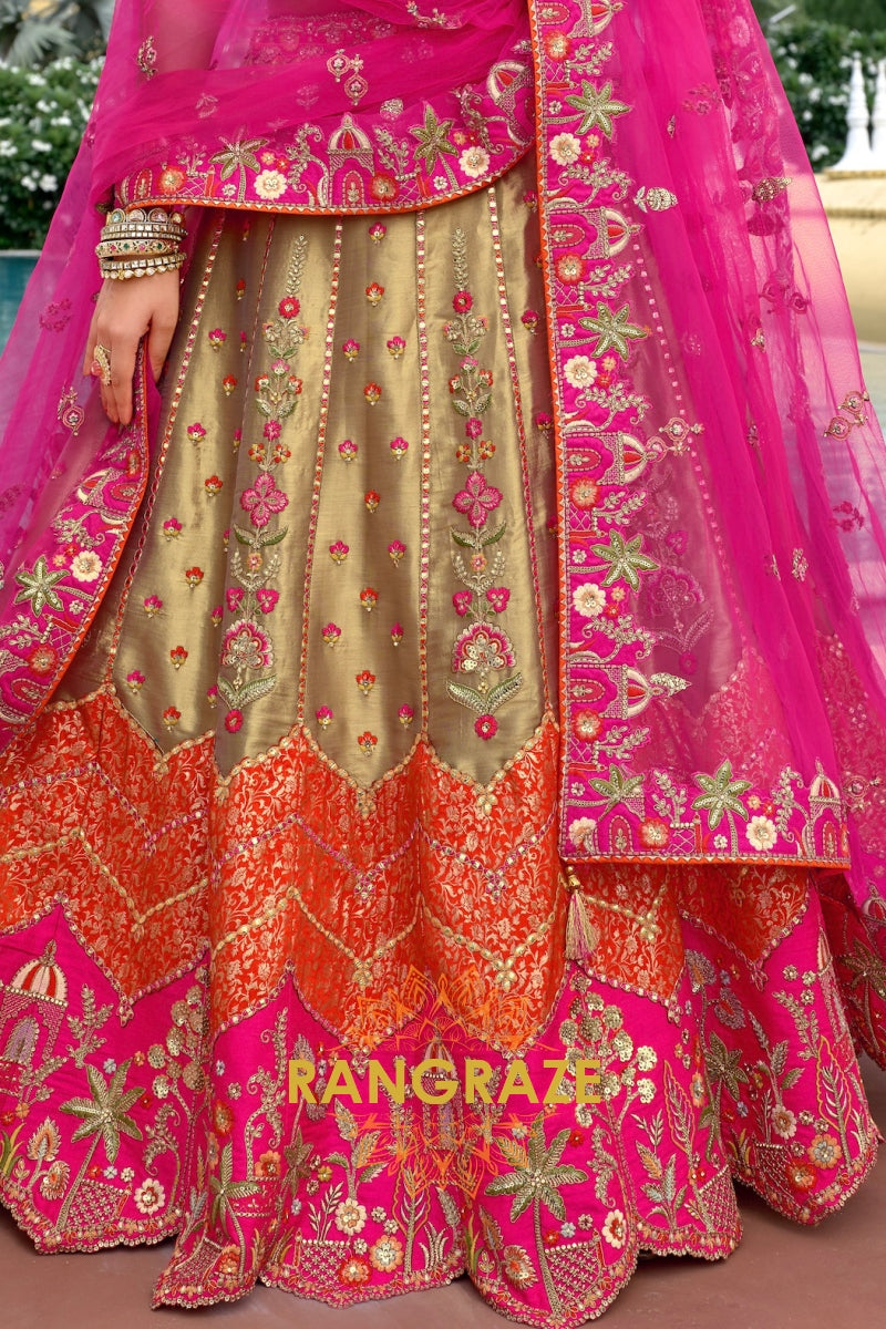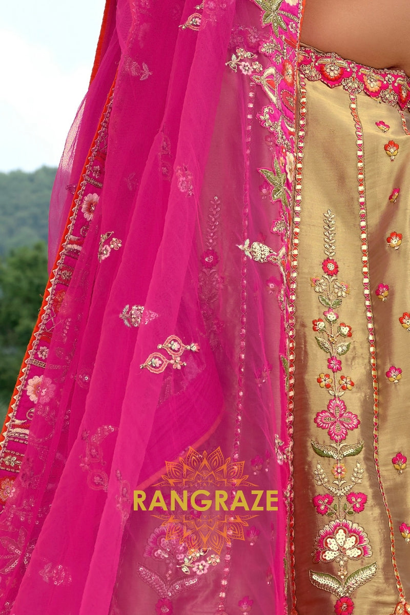 Designed in a luxurious combination of rich fuchsia pink, antique gold, and warm orange hues, the lehenga is adorned with elaborate heritage-inspired motifs, florals, and traditional elements. Fine embroidery using resham, zari, sequins, stone, and subtle mirror work enhances the visual richness of each panel. The heavily embroidered scalloped hem and expansive 4.2-meter ghera create a majestic silhouette with dramatic movement.