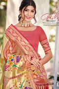 Celebrate tradition with this exquisite Paithani silk saree from RangRaze. Woven in a rich hue with Kanjivaram pattern, it features intricate handwoven motifs and a beautifully detailed pallu that reflects classic Maharashtrian craftsmanship. Accented with a contrasting border and luxurious silk texture, this saree is perfect for weddings, festive occasions, and cultural celebrations. A true heirloom piece that blends grace, heritage, and elegance effortlessly.