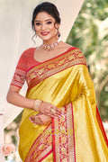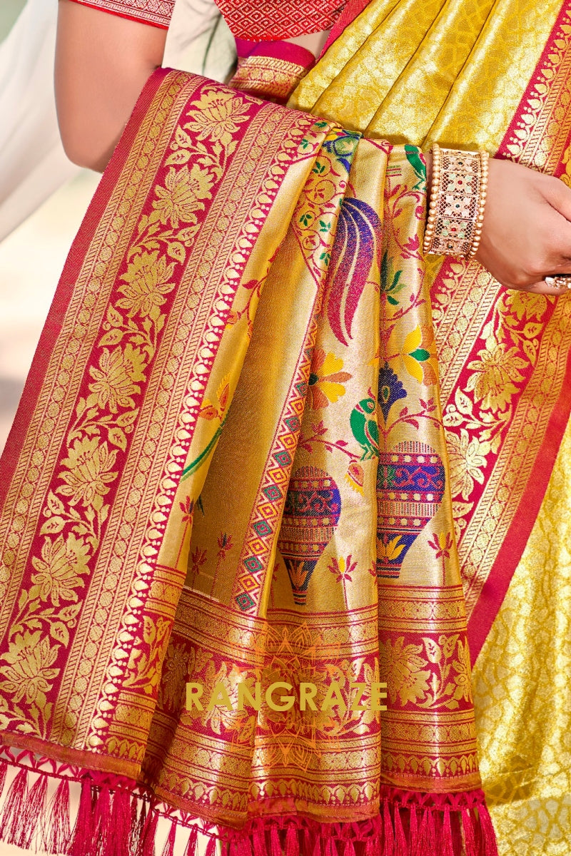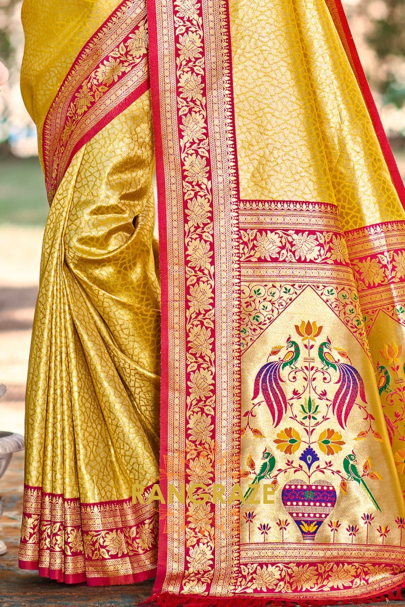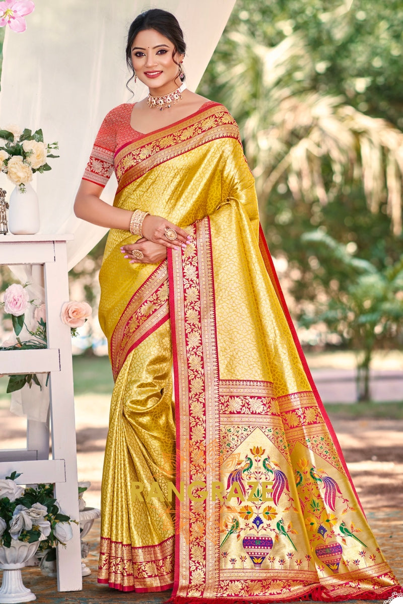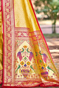 Golden Paithani Inspired Silk Saree with Red Zari Border