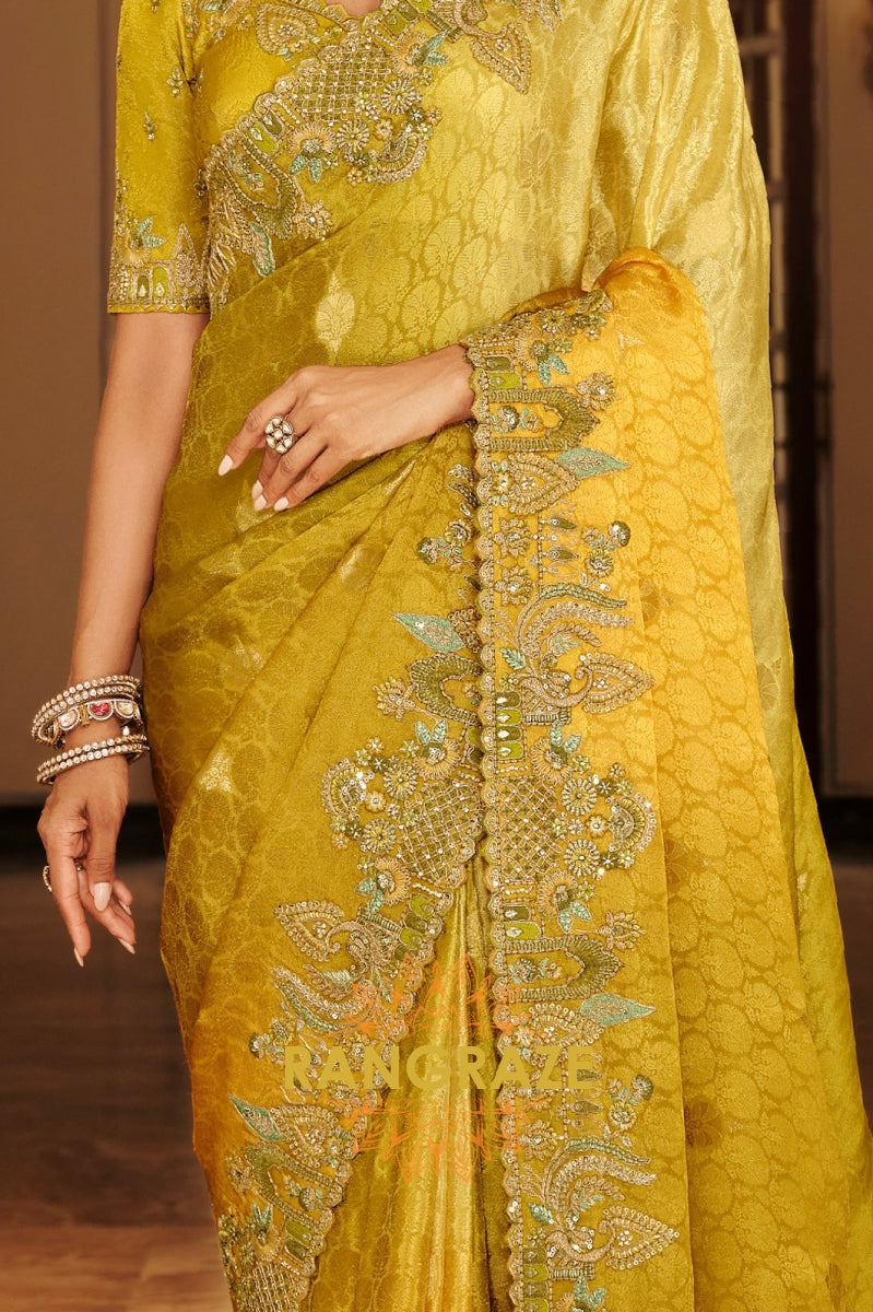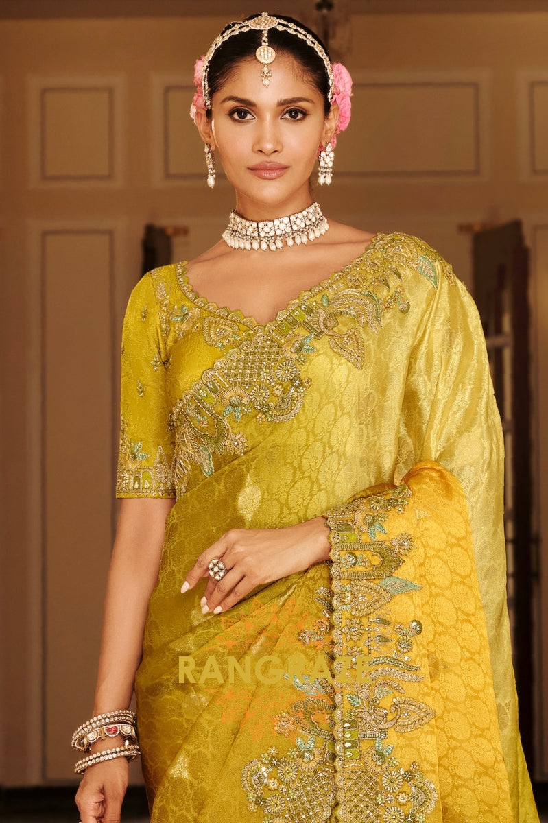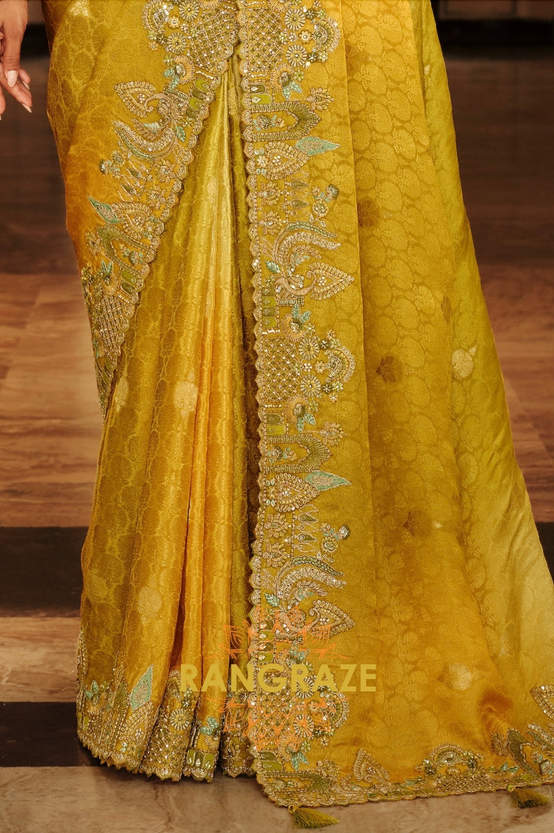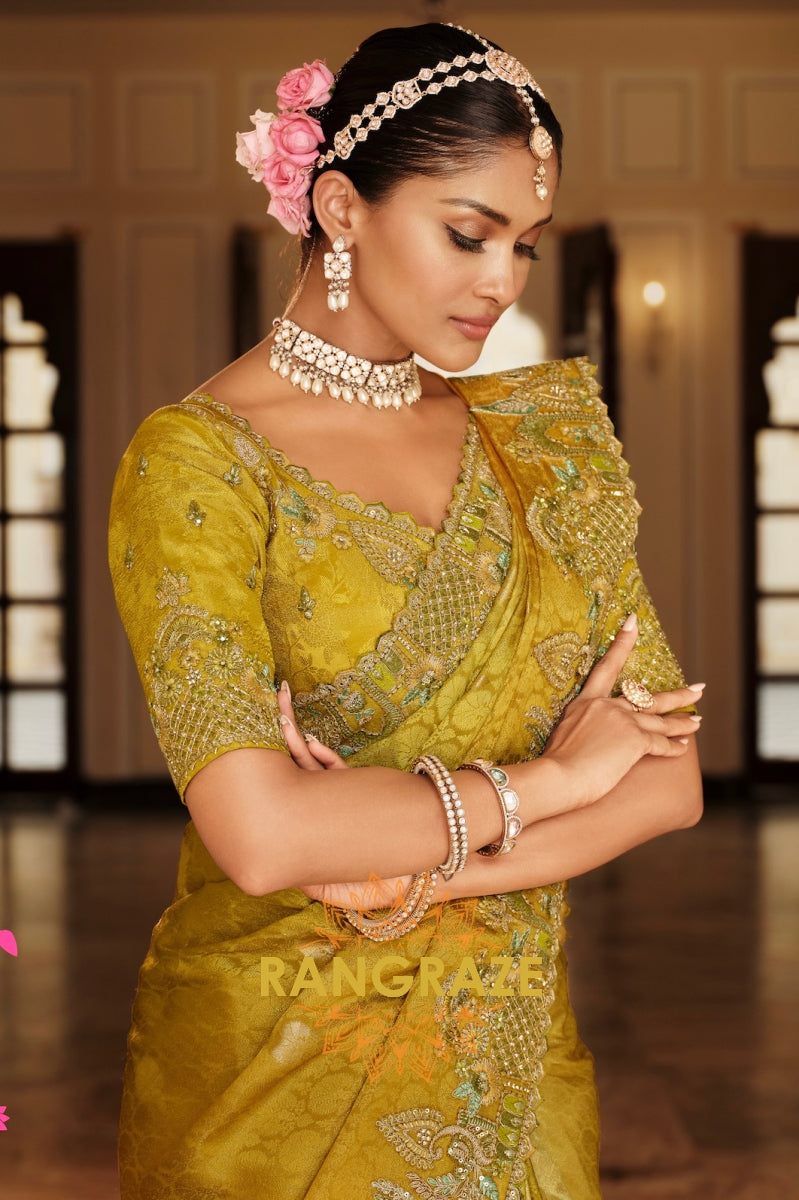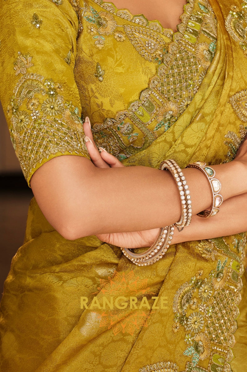 Radiate regal elegance with the Golden Olive Charm Designer Embroidered Tissue Silk Saree. Crafted in a unique golden mustard-olive shade, this masterpiece brings together tradition and sophistication. The saree features rich floral embroidery enhanced with delicate sequin and thread work, creating a luxurious yet graceful aura.