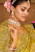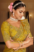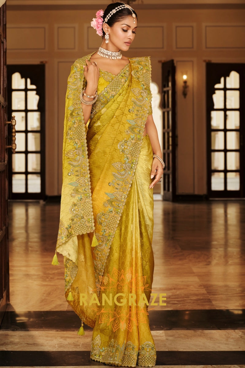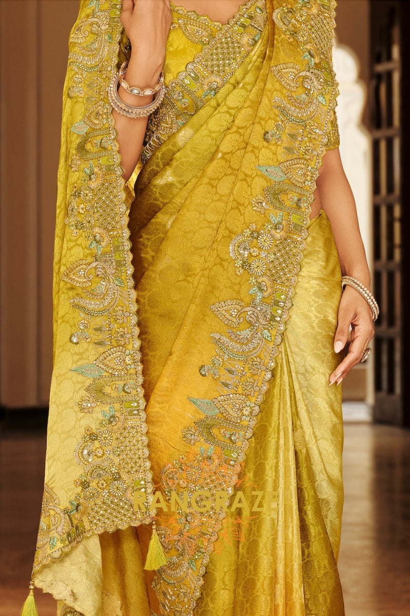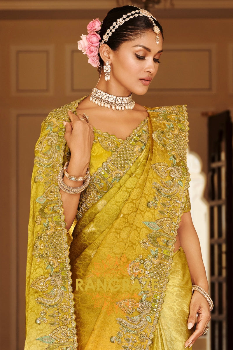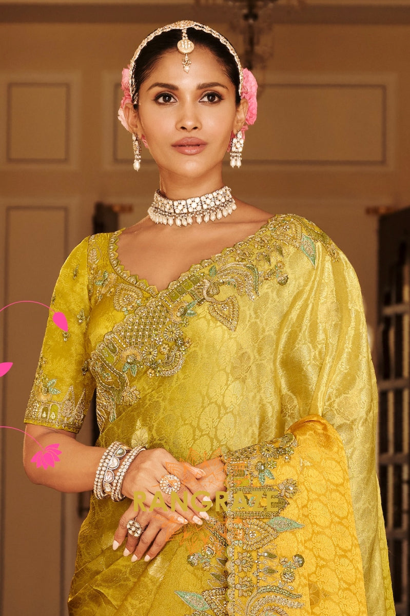 Radiate regal elegance with the Golden Olive Charm Designer Embroidered Tissue Silk Saree. Crafted in a unique golden mustard-olive shade, this masterpiece brings together tradition and sophistication. The saree features rich floral embroidery enhanced with delicate sequin and thread work, creating a luxurious yet graceful aura.
