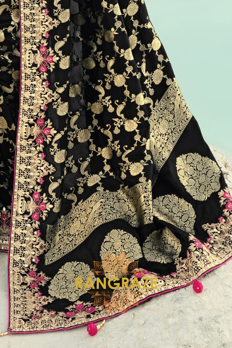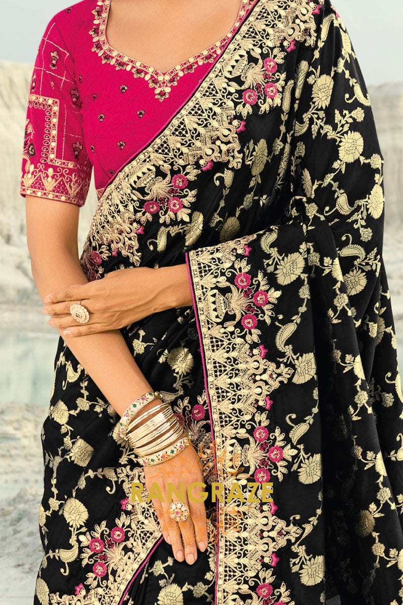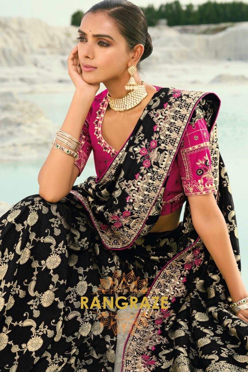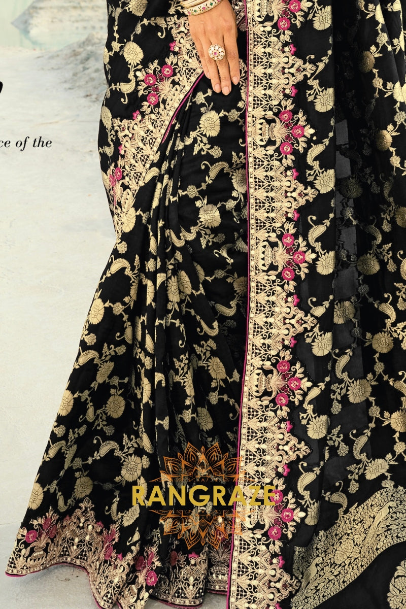 Drape yourself in timeless grandeur with this Black Pure Silk Designer Embroidered Saree, an exquisite ensemble that blends classic elegance with opulent craftsmanship, making it a perfect choice for weddings, receptions, and elite festive celebrations.