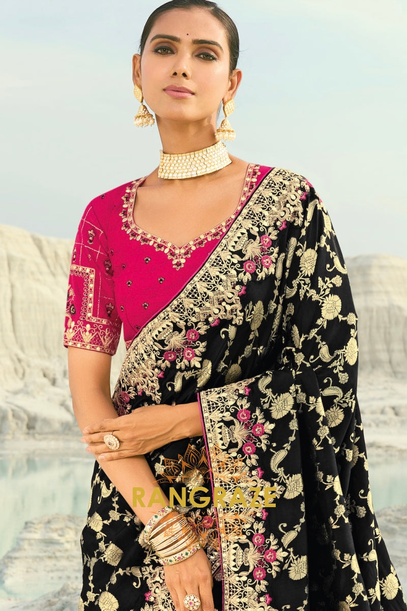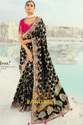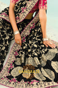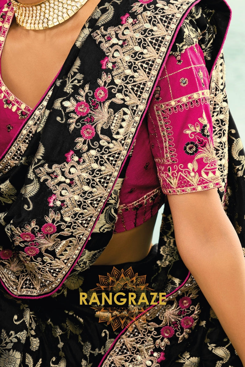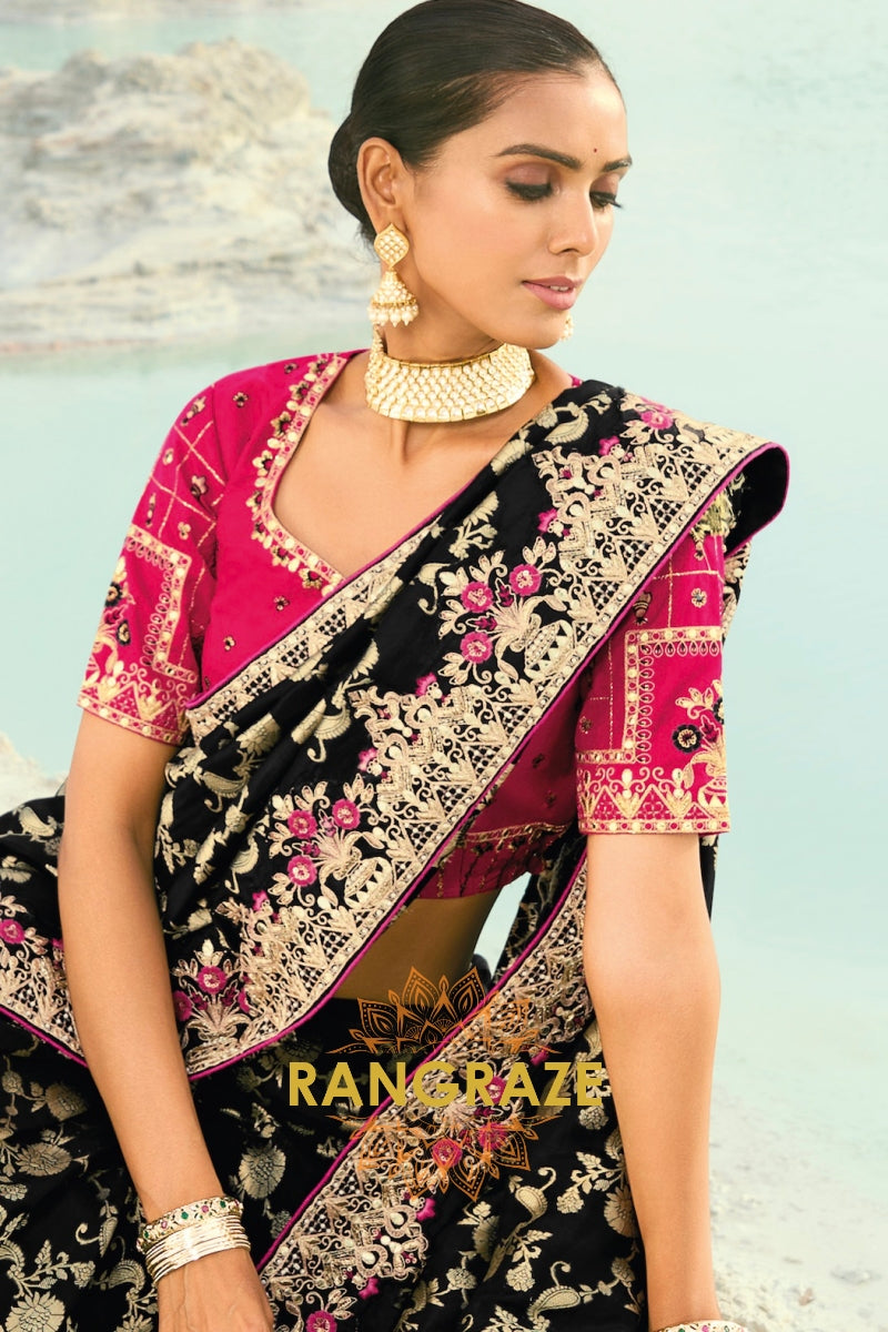 Drape yourself in timeless grandeur with this Black Pure Silk Designer Embroidered Saree, an exquisite ensemble that blends classic elegance with opulent craftsmanship, making it a perfect choice for weddings, receptions, and elite festive celebrations.