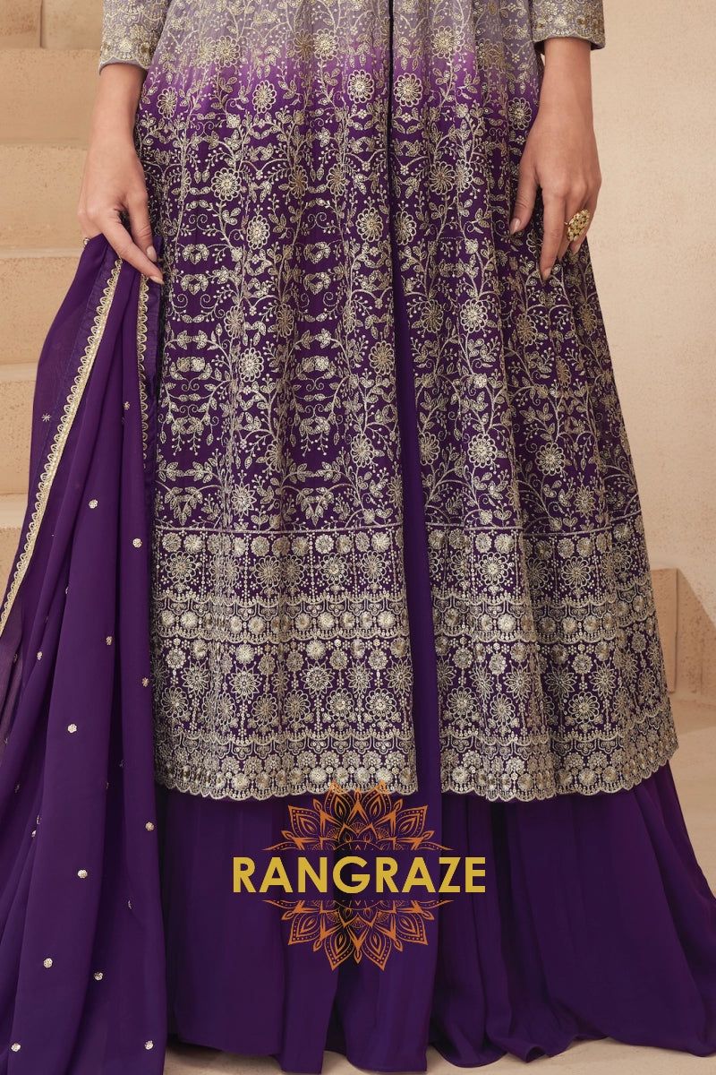 Paired with a flared lehenga in rich purple, this ensemble creates a stunning ombré effect that transitions seamlessly from lavender to purple. A lightweight georgette dupatta, adorned with subtle butti work and an intricately detailed lace border, adds a final touch of refinement to this luxurious outfit.