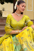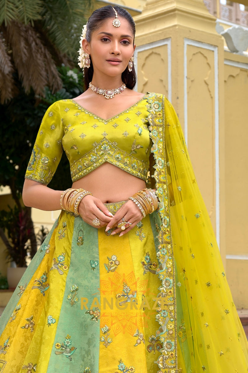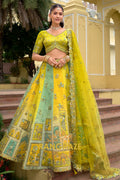 Step into graceful sophistication with this Lime Heritage Panelled Embroidered Bridal Lehenga, a radiant ensemble that blends refreshing hues with timeless craftsmanship, ideal for brides and festive celebrations alike.