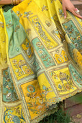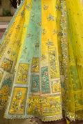 A soft net dupatta in a complementary lime tone completes the ensemble, embellished with dainty embroidered motifs and a richly detailed floral border. Finished with scalloped edges, it drapes effortlessly to add a light, ethereal charm to the look.