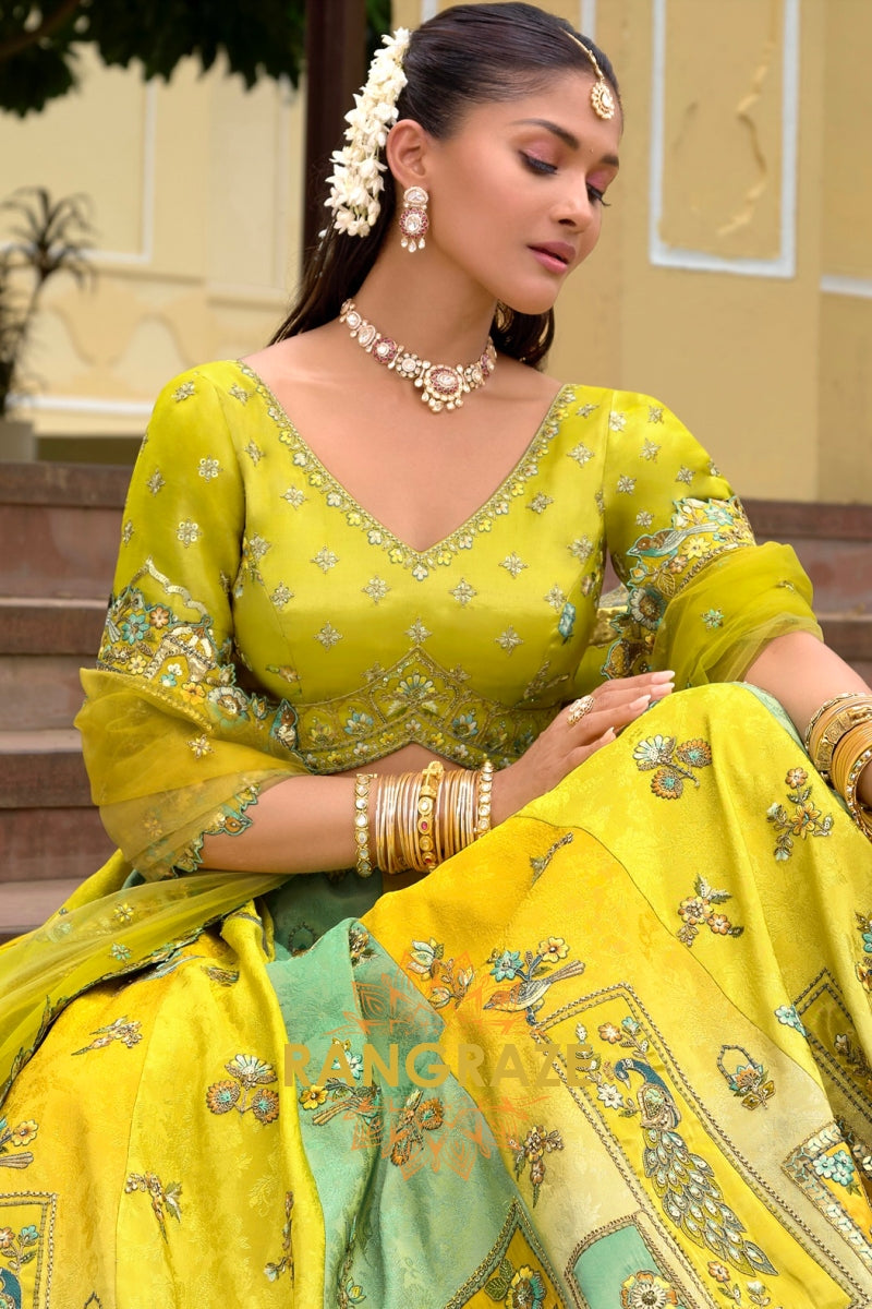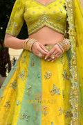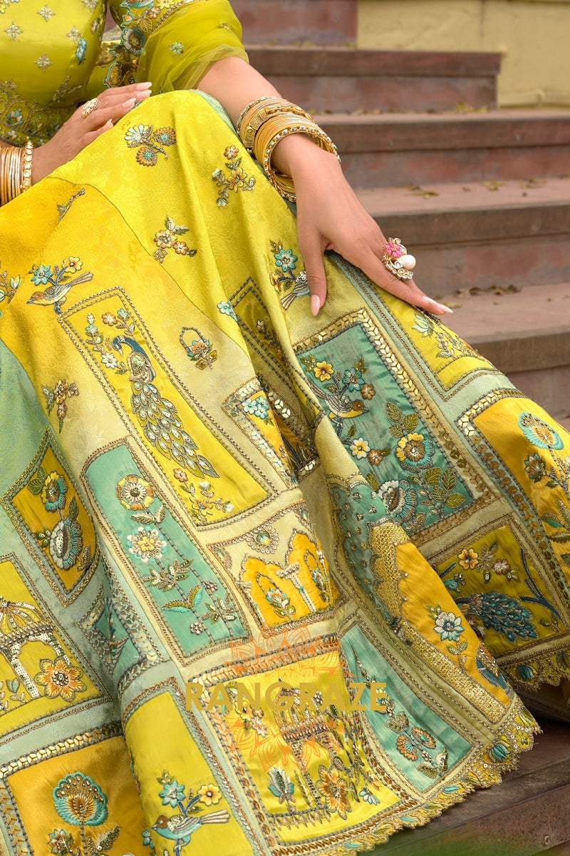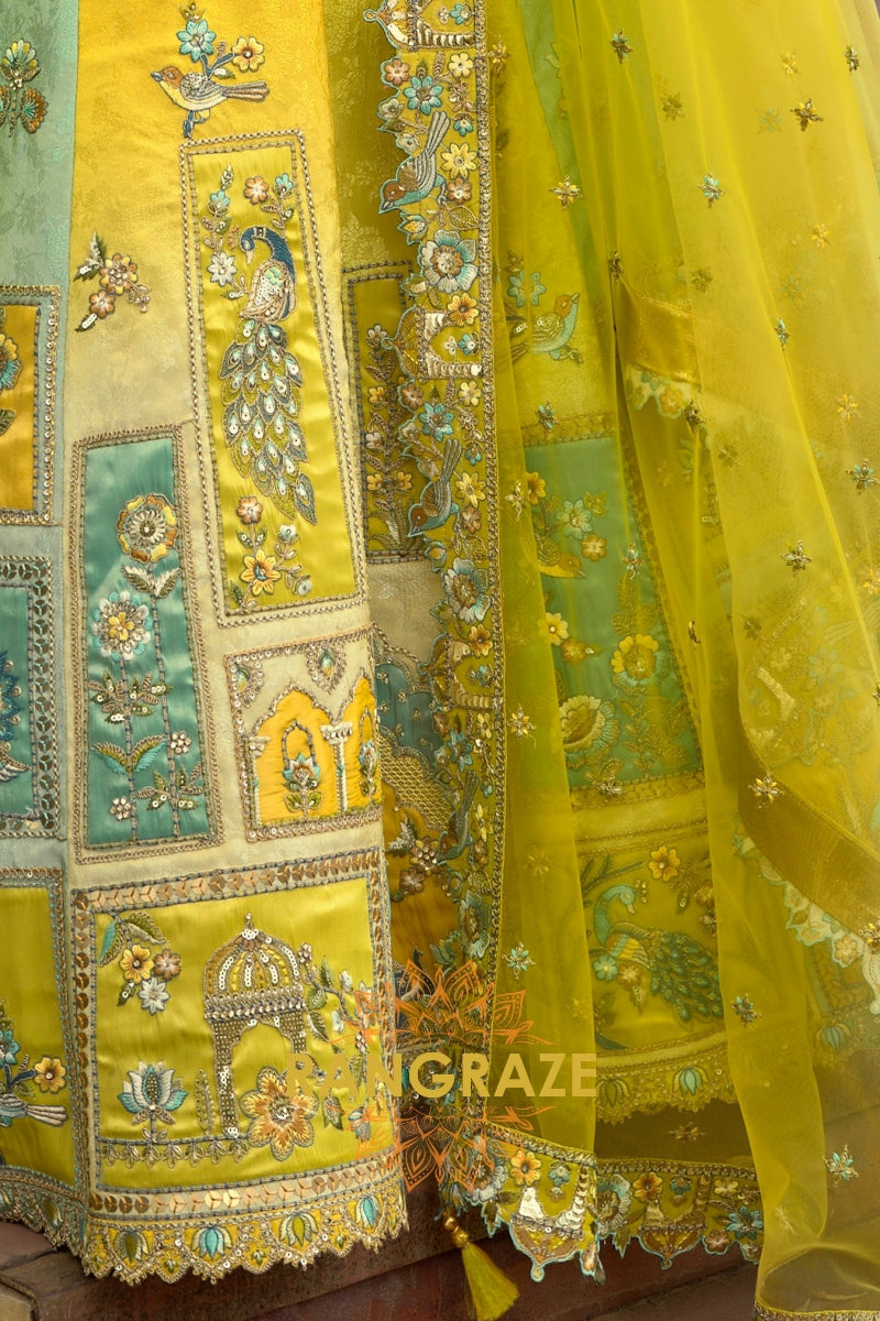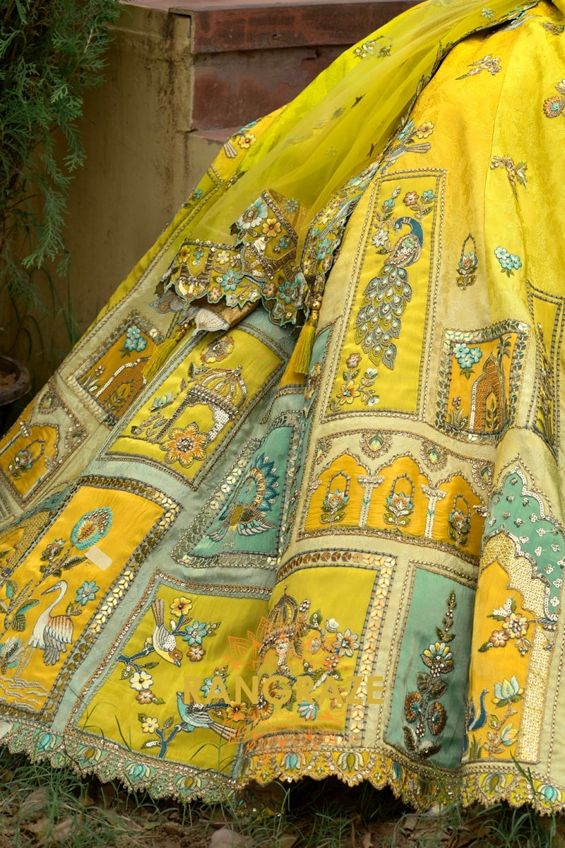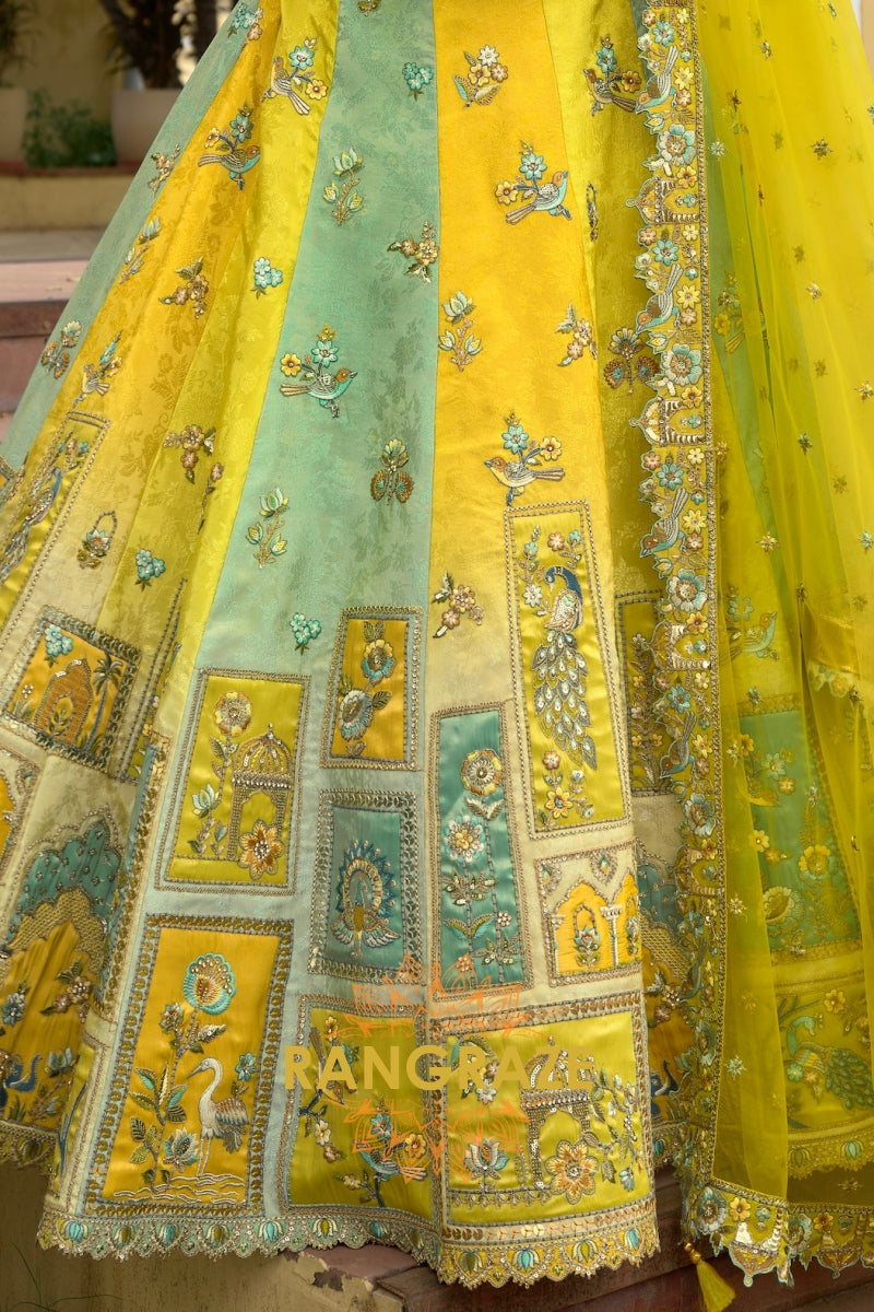 Crafted in a vibrant lime yellow and soft pistachio green panelled base, the lehenga is adorned with intricate heritage-inspired motifs, including florals, temple elements, and traditional patterns. Fine embroidery using resham, zari, sequins, stone, and subtle mirror work enhances each panel, creating a rich tapestry of detail. The heavily embroidered scalloped hem and the expansive 4.2-meter ghera lend the lehenga a regal volume and fluid elegance.