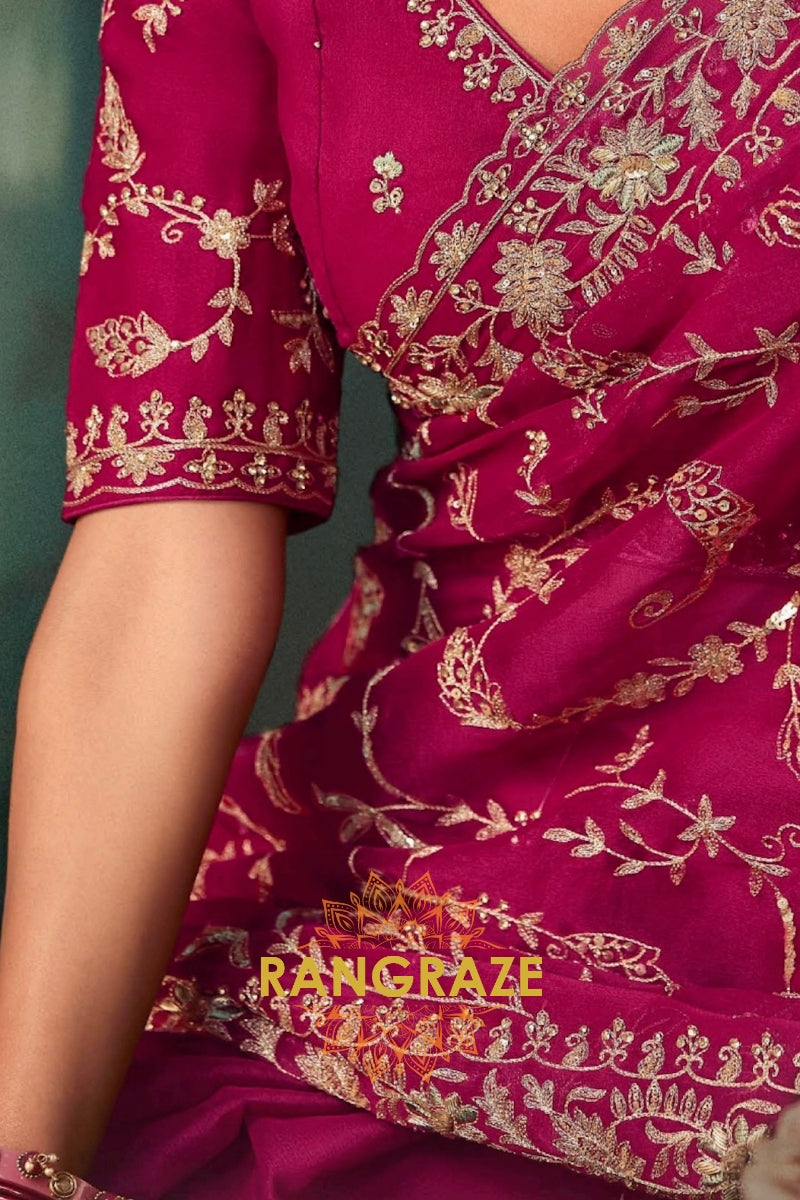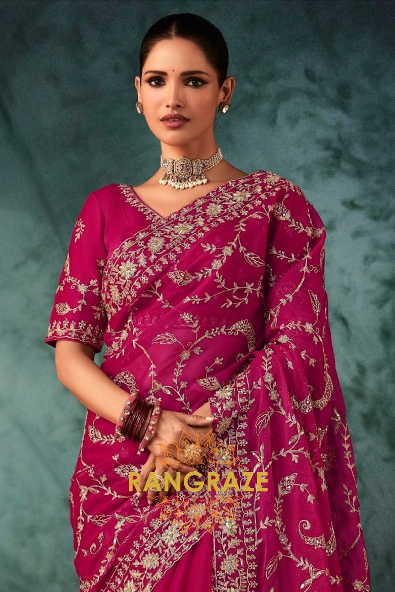 Crafted in a luxurious premium silky fabric, this rich magenta saree is adorned with exquisite all-over embroidery inspired by elegant floral and vine motifs. The intricate handwork features fine, resham, sequins, and subtle stone embellishments, creating a refined texture and radiant finish. The heavily embroidered pallu and ornate border stand out as the highlight of the saree, showcasing dense craftsmanship that enhances the fluid drape and overall opulence.