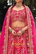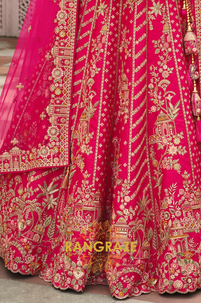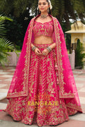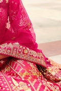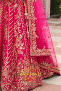 The ensemble is completed with a fuchsia net dupatta, delicately adorned with golden embroidery and a finely detailed border. Designed for versatile draping, it flows effortlessly over the shoulders or head, adding an ethereal and royal touch to the bridal look.