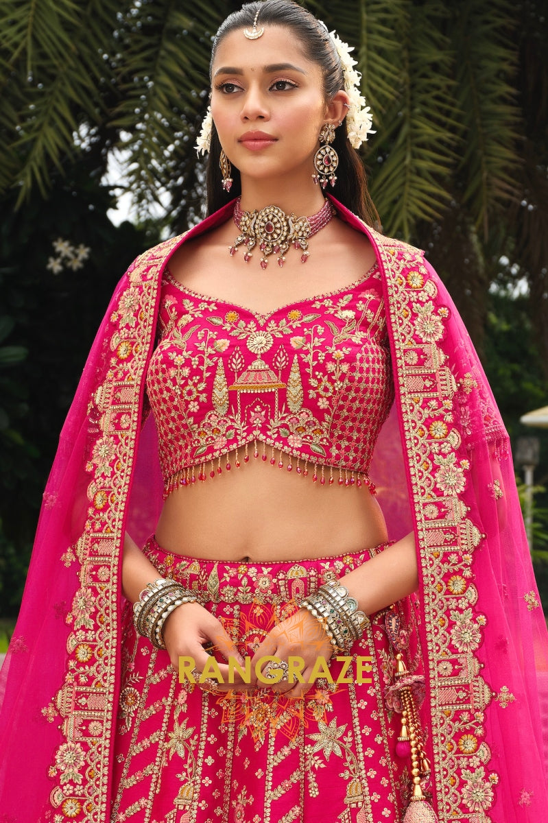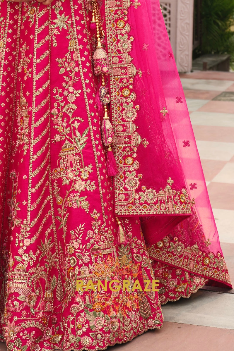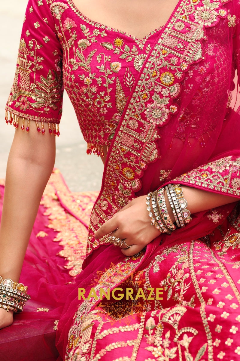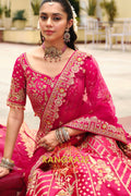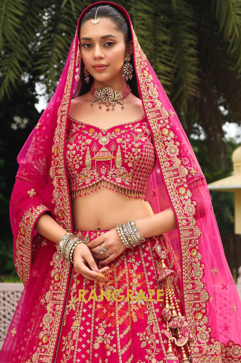 Unveil the allure of timeless elegance with the Majestic Fuchsia Bridal Banarasi Silk Lehenga — a breathtaking creation that embodies grandeur, tradition, and contemporary sophistication. Designed for the modern bride, this ensemble blends intricate craftsmanship with the luxurious charm of Banarasi silk, creating a look that is both regal and radiant.