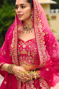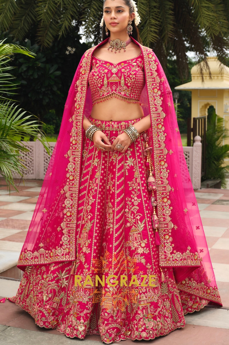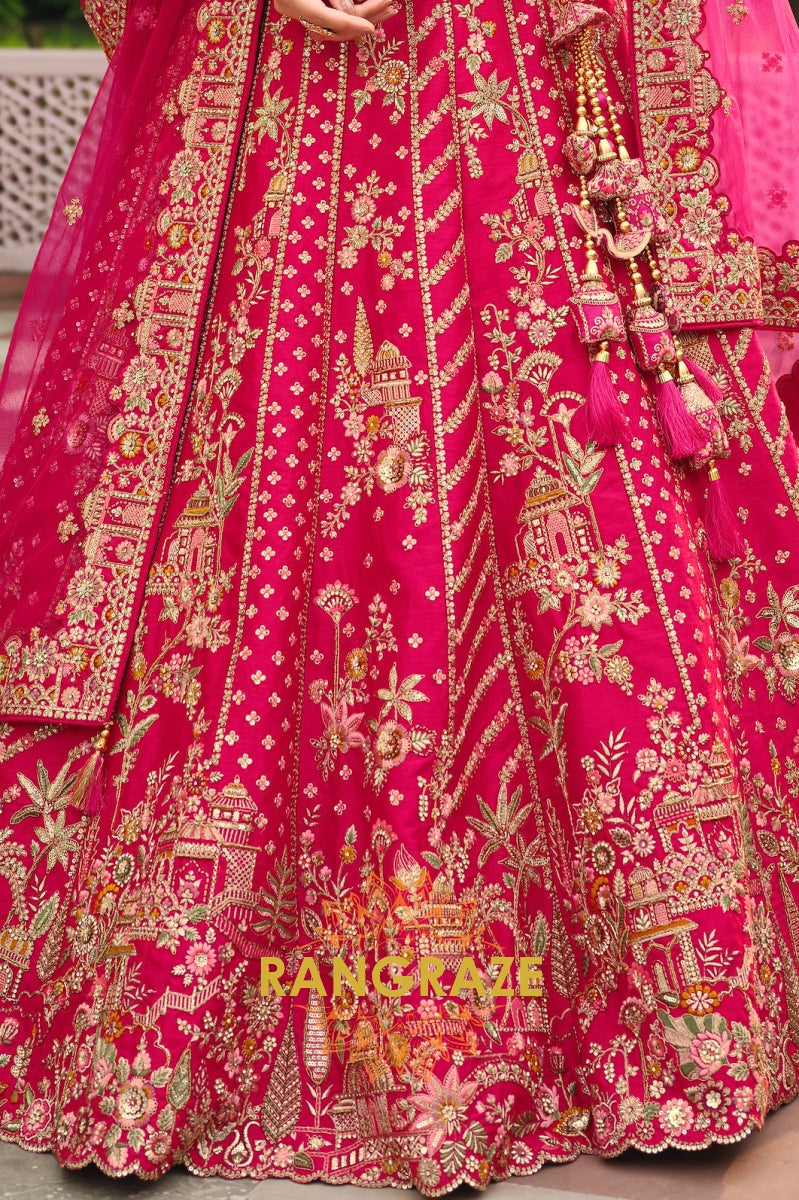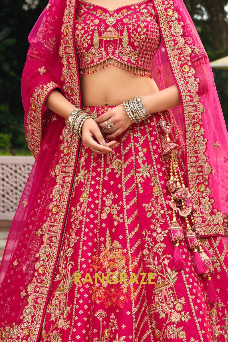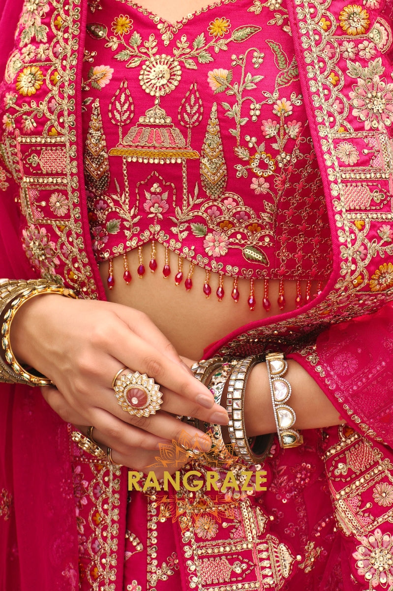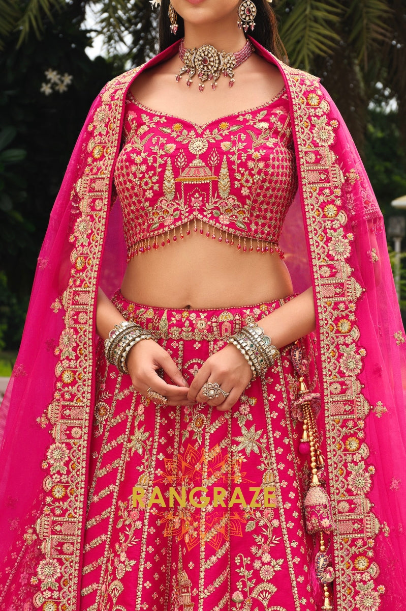 Unveil the allure of timeless elegance with the Majestic Fuchsia Bridal Banarasi Silk Lehenga — a breathtaking creation that embodies grandeur, tradition, and contemporary sophistication. Designed for the modern bride, this ensemble blends intricate craftsmanship with the luxurious charm of Banarasi silk, creating a look that is both regal and radiant.