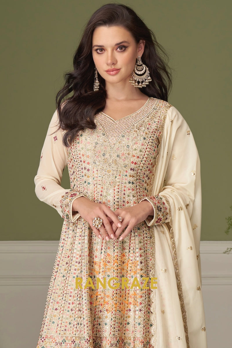 Pair this ivory sharara suit with pearl or polki jewellery for a soft, regal look. Opt for dewy makeup with neutral tones and softly defined eyes. Finish with embroidered juttis or champagne-toned heels to maintain an elegant, refined aesthetic.