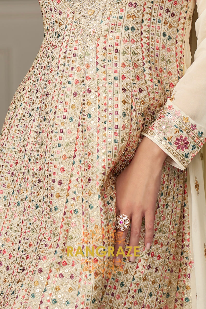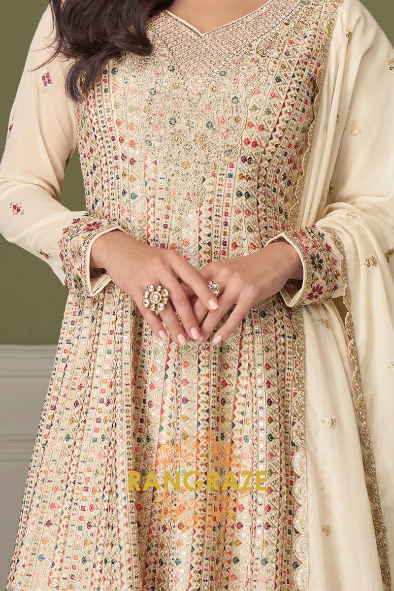 Crafted from premium pure georgette fabric, the kurta showcases exquisite hand embroidery across the neckline, bodice, sleeves, and hem. Delicate threadwork paired with subtle multicolour accents creates a beautifully textured surface, while the flared silhouette lends effortless movement and sophistication.