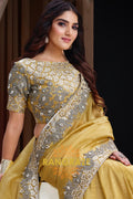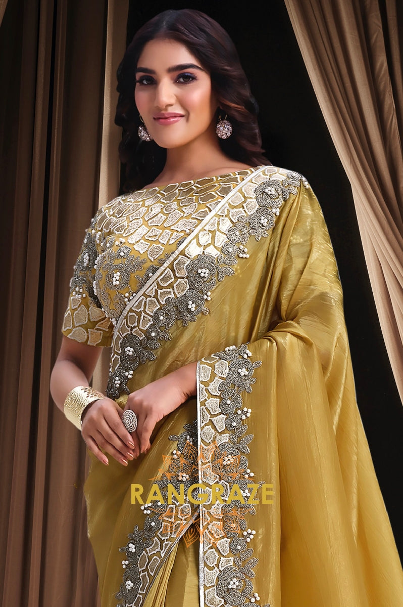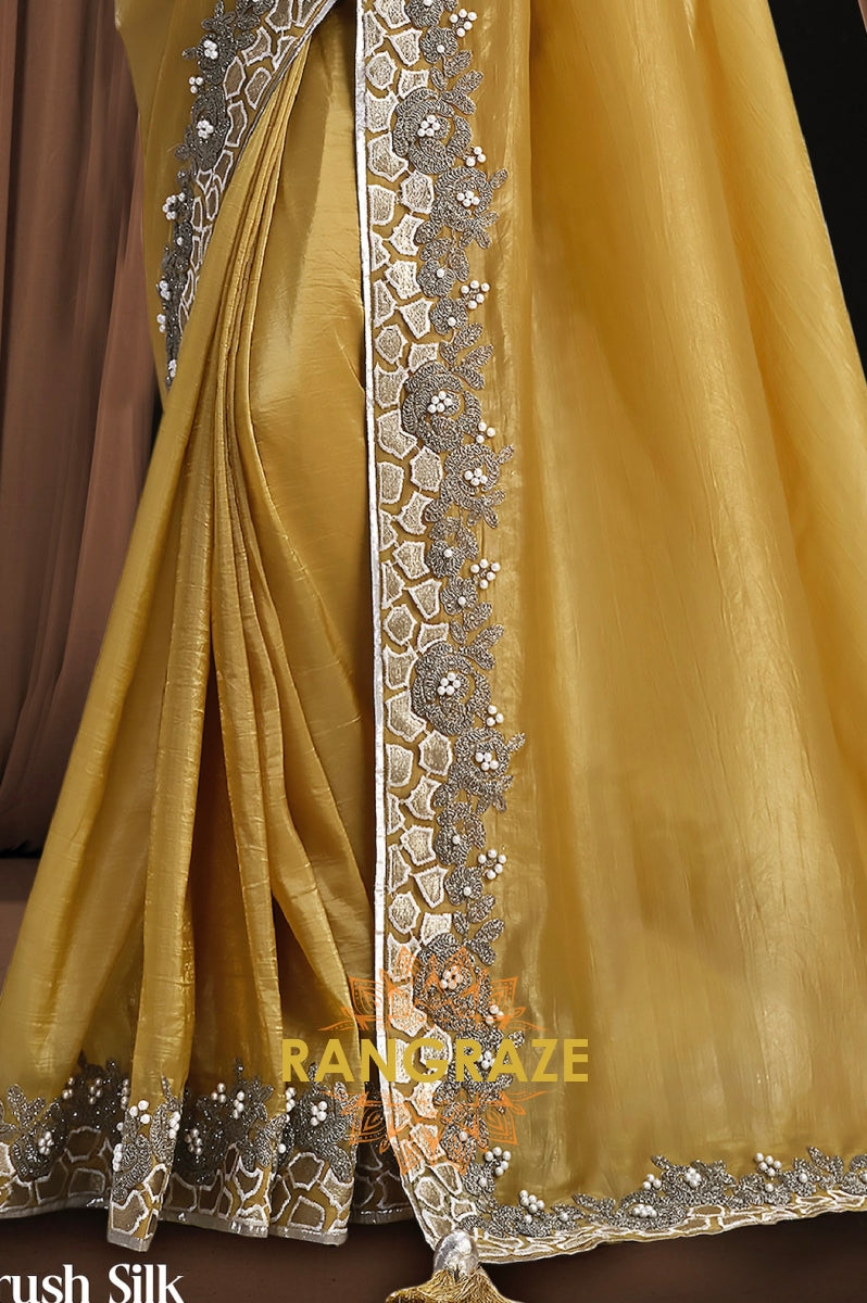 Elevate your ethnic wardrobe with this opulent Mustard Gold Premium Banarasi Crush Silk Saree from RangRaze. Designed to exude regal charm, this saree features a rich mustard-gold hue complemented by intricate silver-toned embroidery and elegant border detailing that enhances its luxurious appeal.