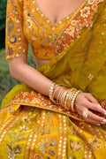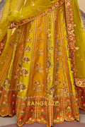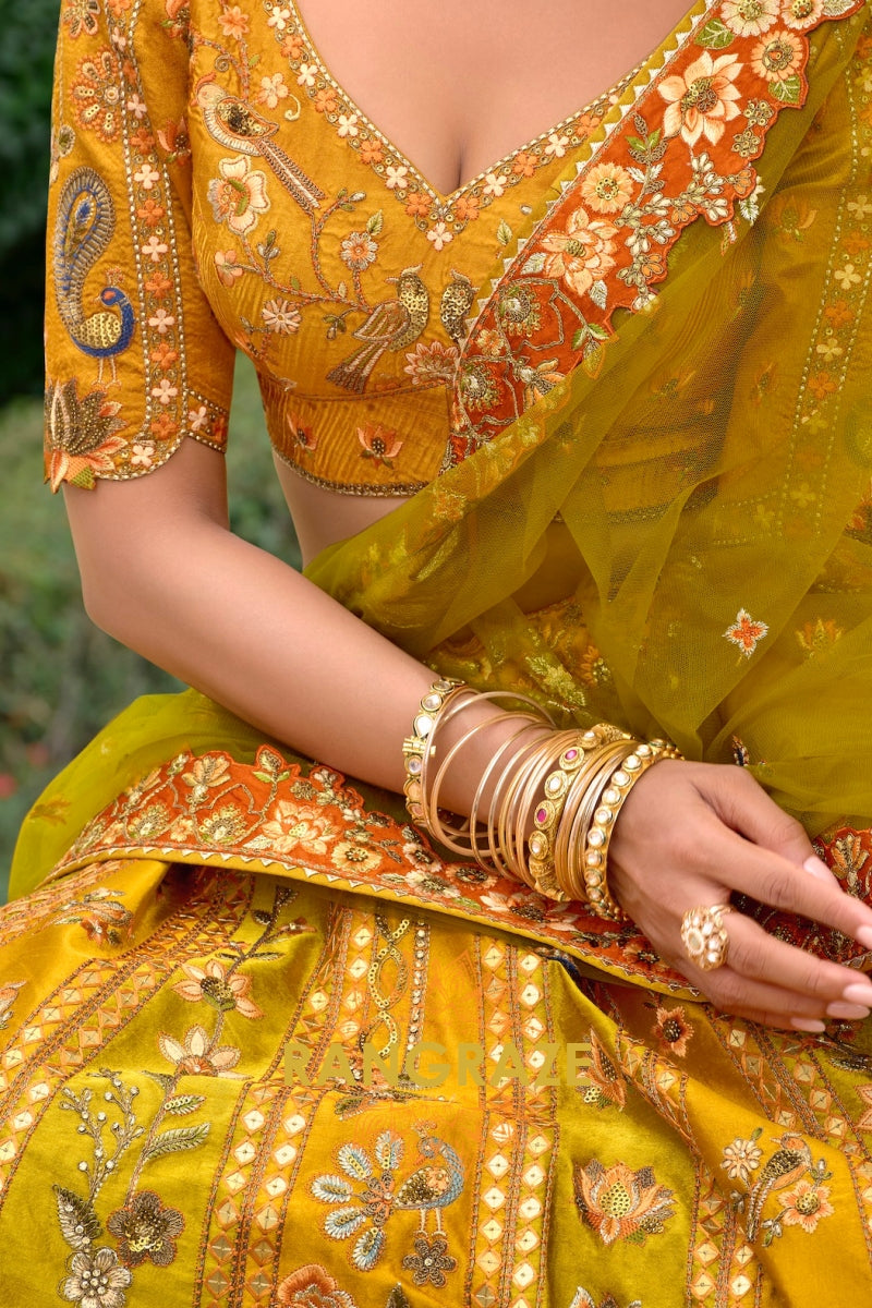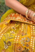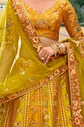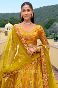 Step into timeless elegance with this Mustard Heritage Embroidered Bridal Lehenga, a radiant ensemble that celebrates rich Indian craftsmanship infused with royal charm, perfect for brides and festive connoisseurs alike.