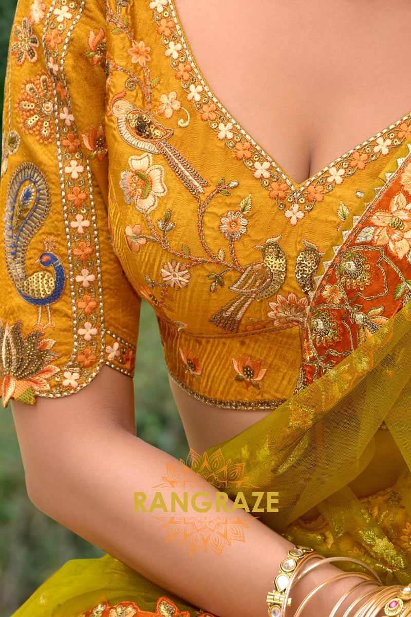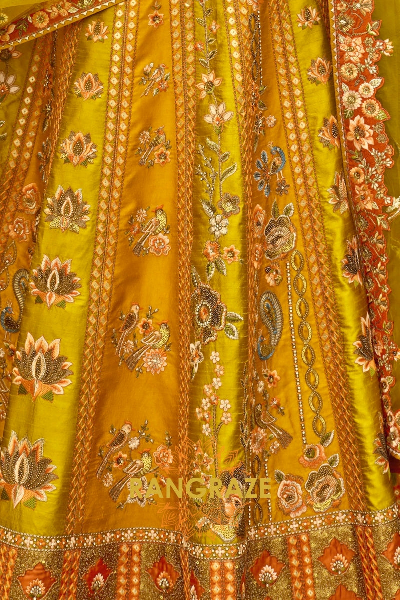 Rendered in a vibrant mustard yellow base with warm rust and olive undertones, the lehenga is exquisitely adorned with intricate floral and traditional motifs inspired by heritage artistry. Detailed embroidery featuring resham, zari, sequins, stone, and subtle mirror work creates a luxurious texture and depth. The beautifully structured panels and heavily embroidered scalloped hem add grandeur, while the expansive 4.2-meter ghera ensures a dramatic and graceful flare with every movement.