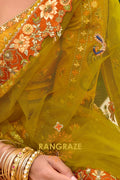 The matching mustard blouse is intricately embroidered with coordinated floral motifs and traditional detailing. Designed with a flattering V-neckline and full sleeves, it balances regal aesthetics with contemporary elegance, making it both graceful and statement-worthy.