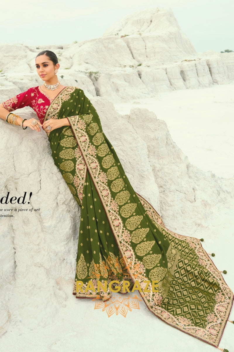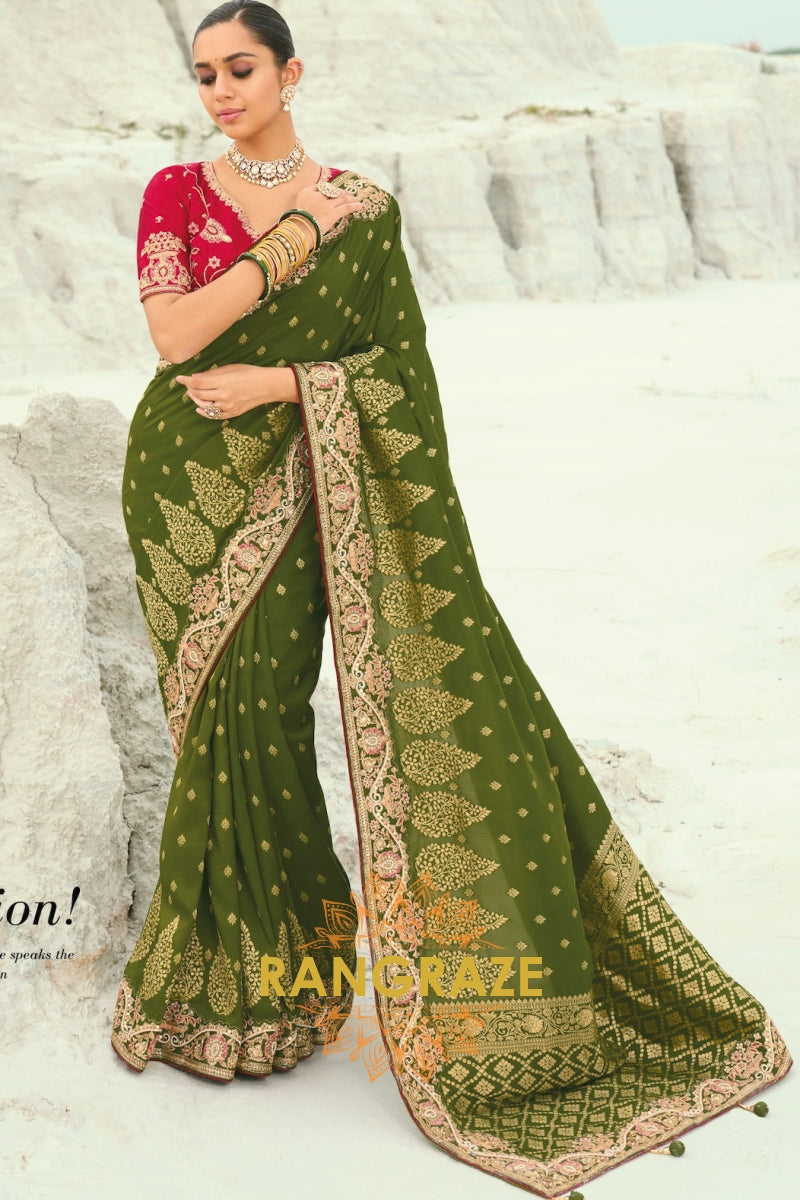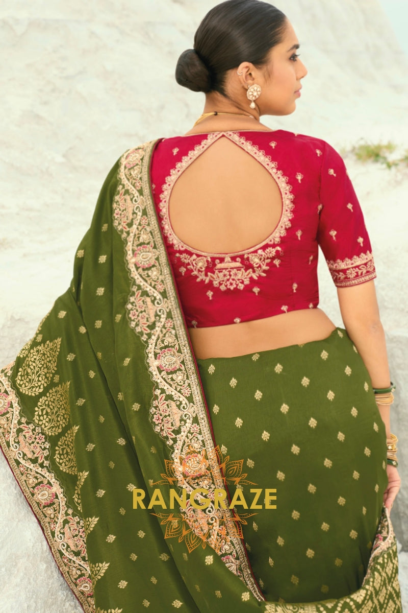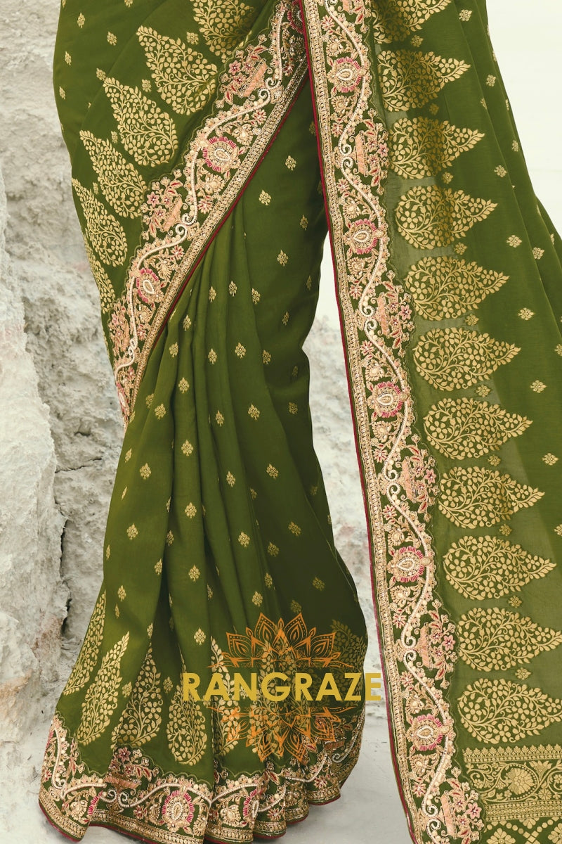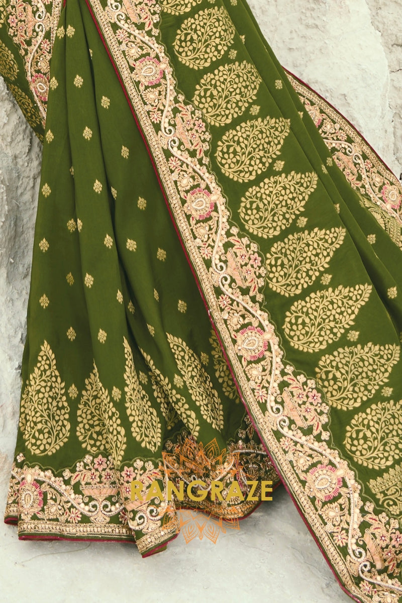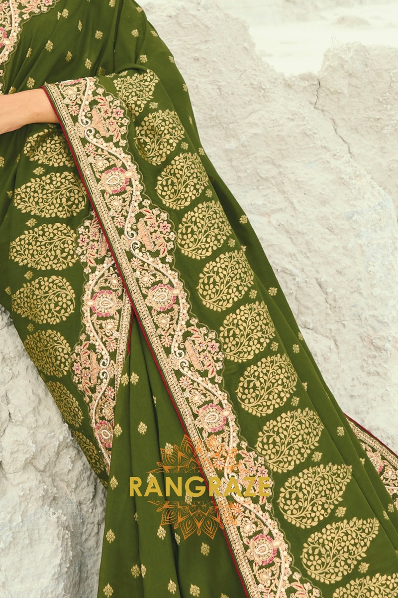 Drape yourself in timeless grandeur with this Olive Green Pure Silk Designer Embroidered Saree, a graceful ensemble that blends royal elegance with exquisite craftsmanship, making it perfect for weddings, receptions, and luxurious festive celebrations.