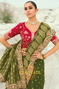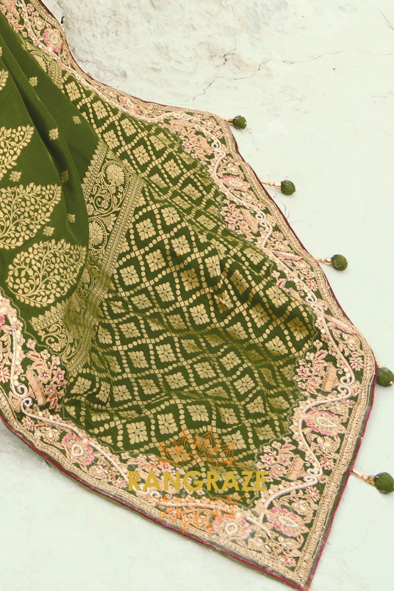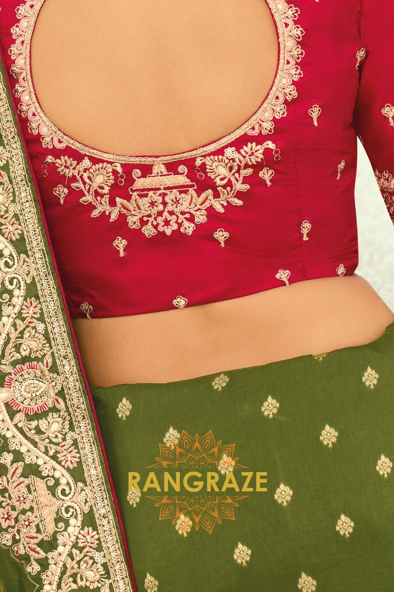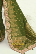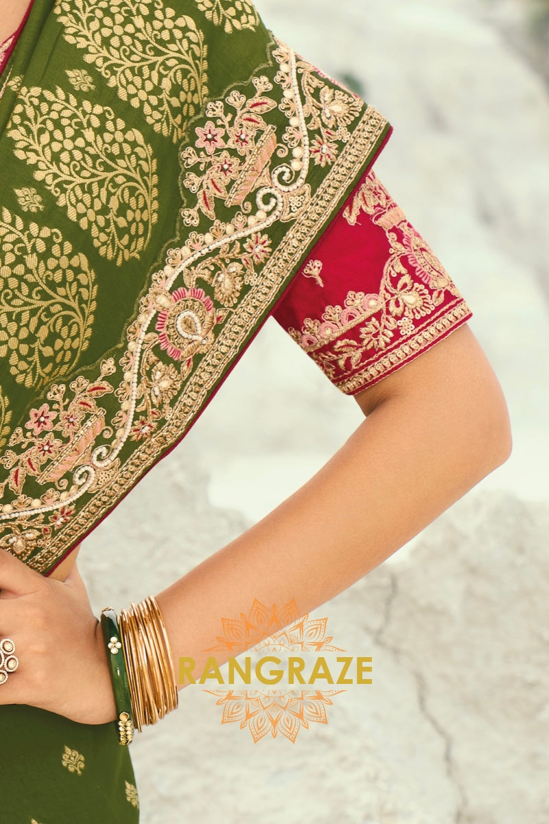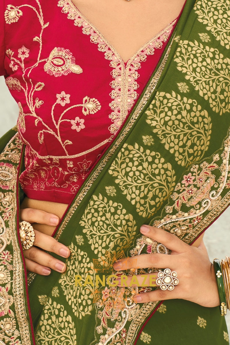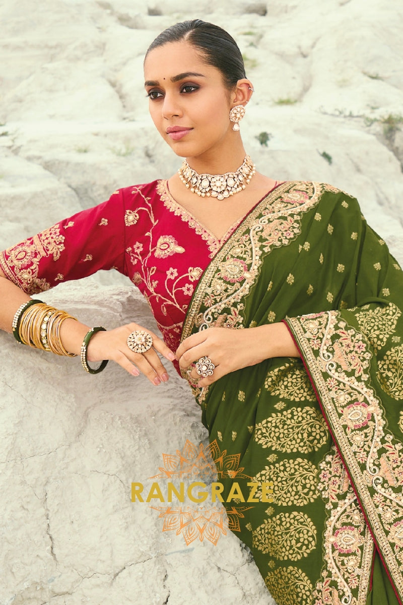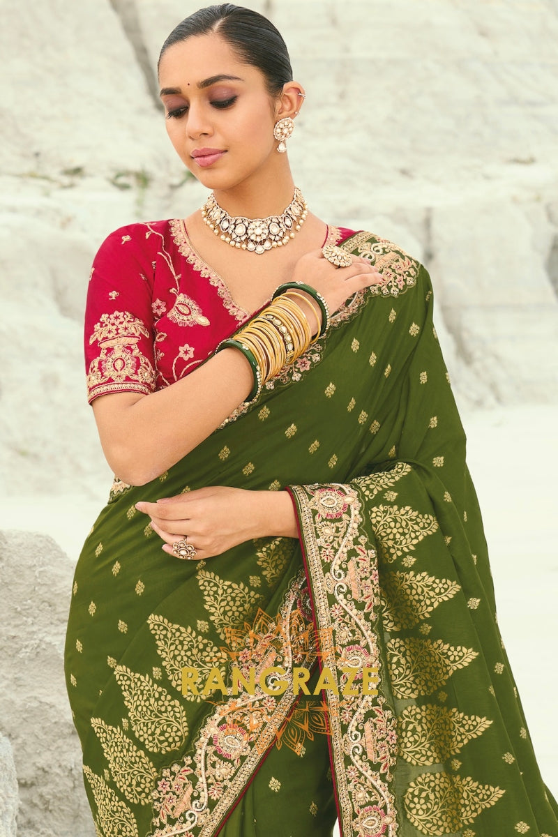 Drape yourself in timeless grandeur with this Olive Green Pure Silk Designer Embroidered Saree, a graceful ensemble that blends royal elegance with exquisite craftsmanship, making it perfect for weddings, receptions, and luxurious festive celebrations.