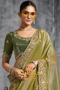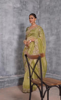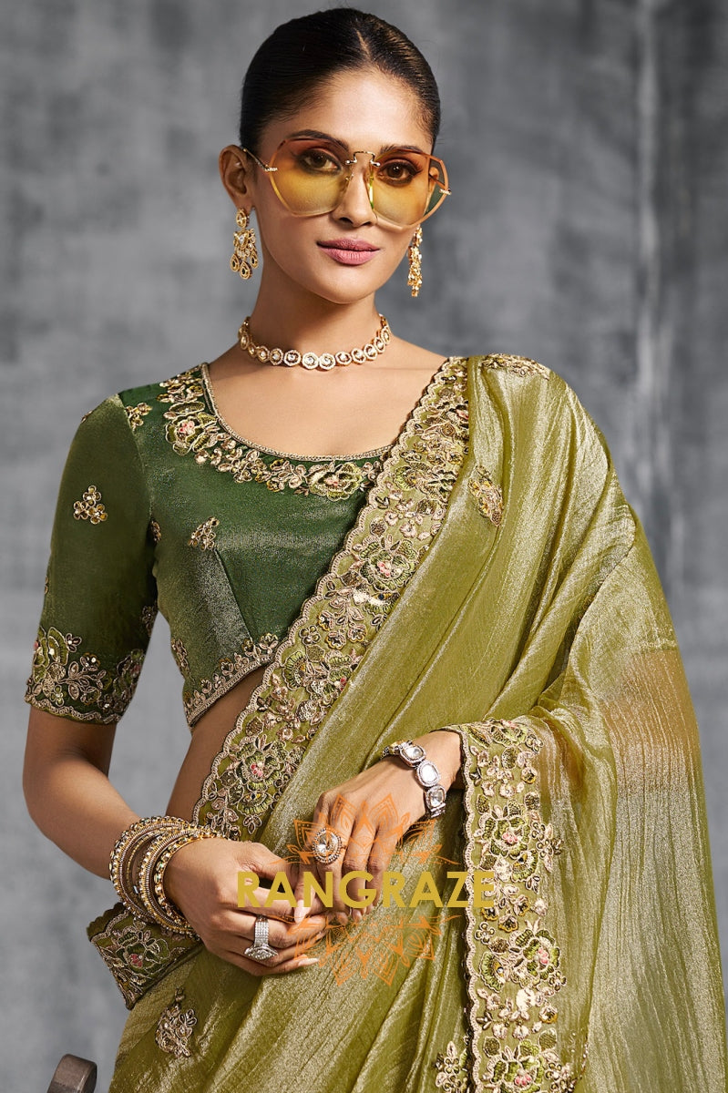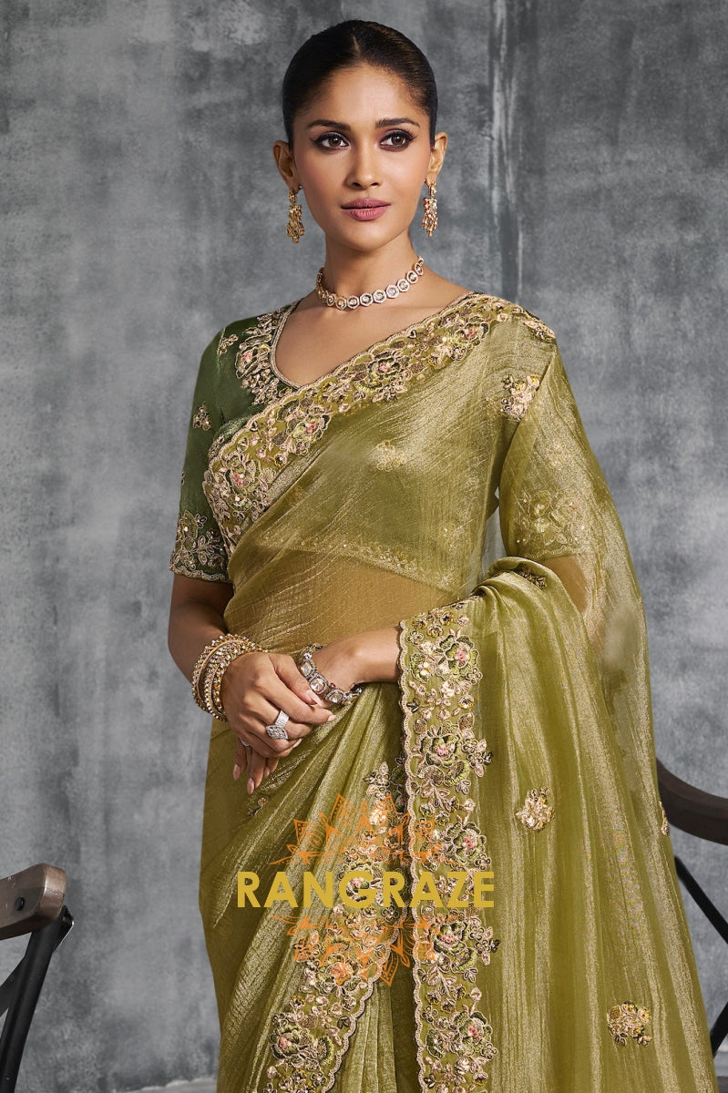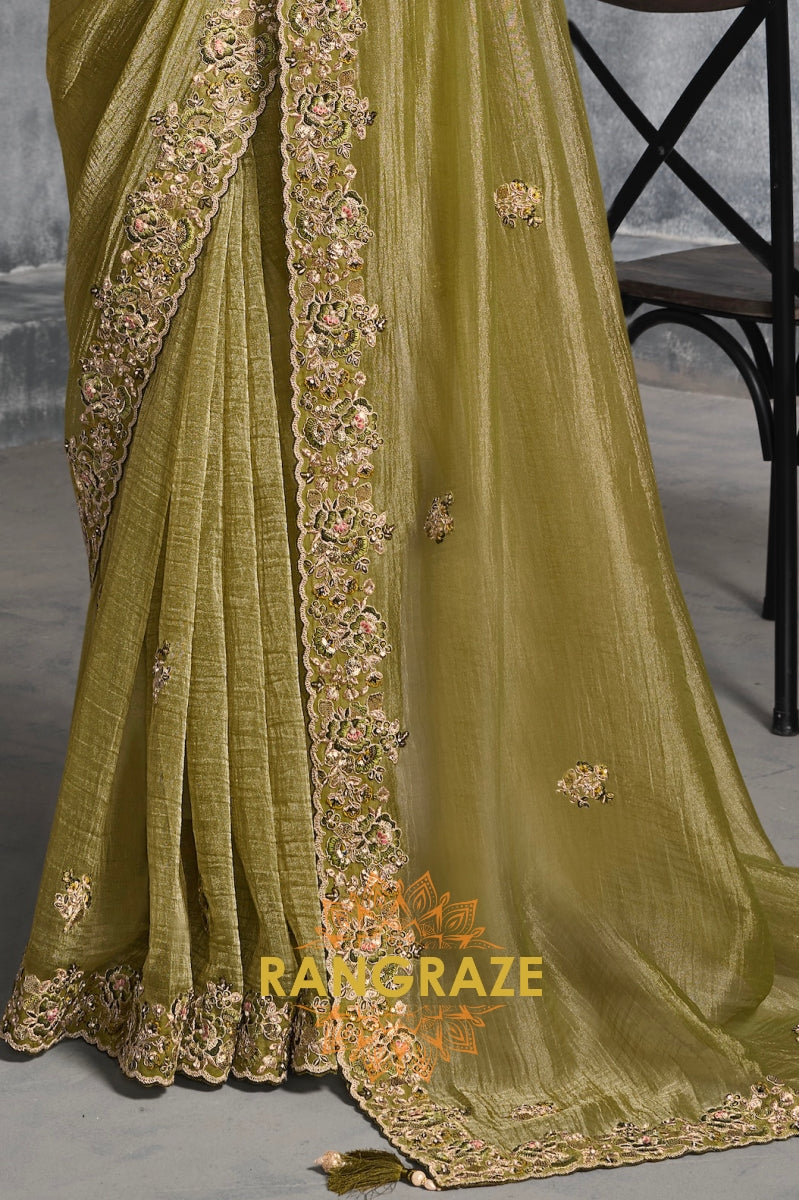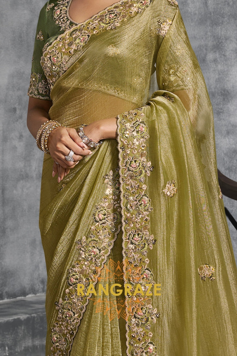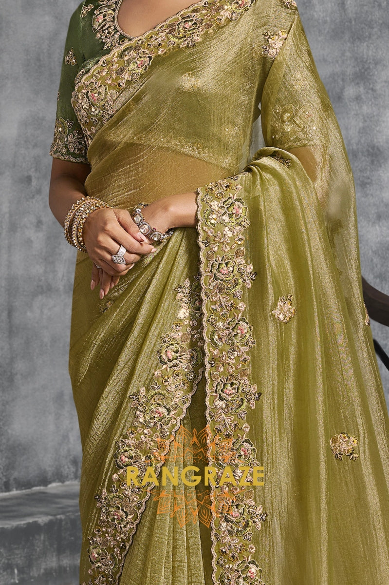 Embrace timeless elegance with this Olive Green Tissue Zari Saree, a perfect blend of sophistication and artisanal craftsmanship. Woven from premium tissue zari fabric, the saree radiates a subtle golden sheen that beautifully complements its rich green hue.