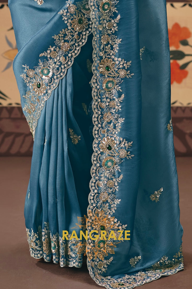 The saree is beautifully adorned with intricate designer embroidery enhanced with sequin, stone, and pearl work, creating a delicate shimmer that elevates its luxurious appeal. A broad, finely detailed embroidered border frames the saree gracefully, while elegant motifs scattered across the drape add depth and richness to the design. Paired with a premium fancy fabric blouse featuring coordinated embroidery work, this ensemble delivers a complete look of refined glamour.