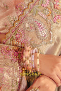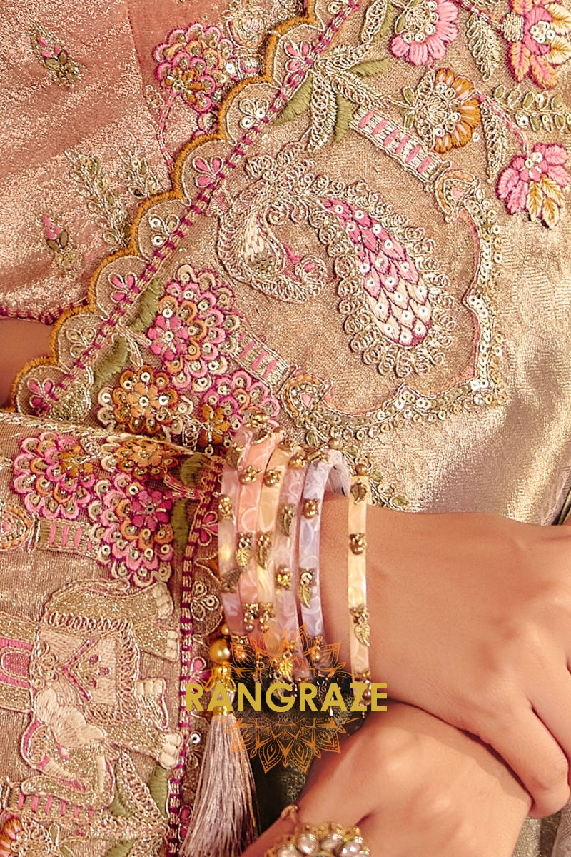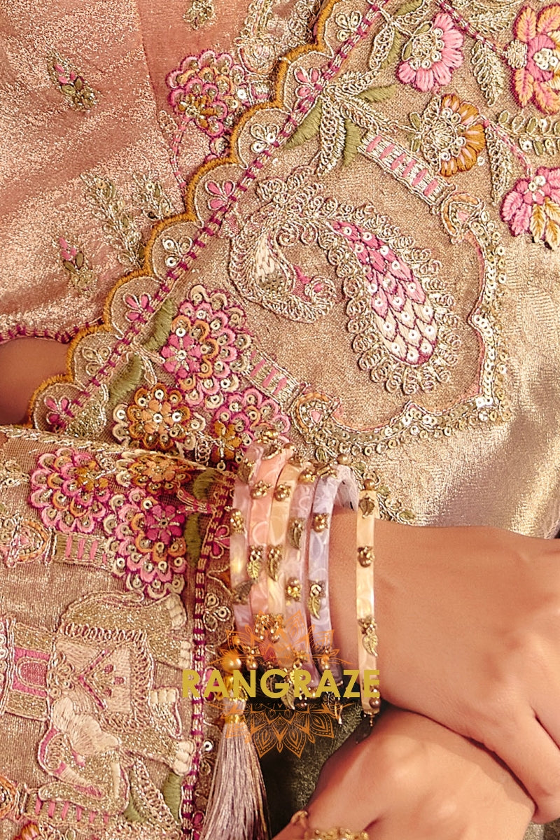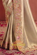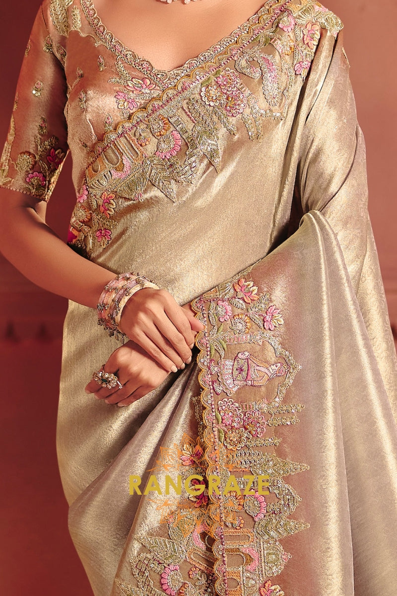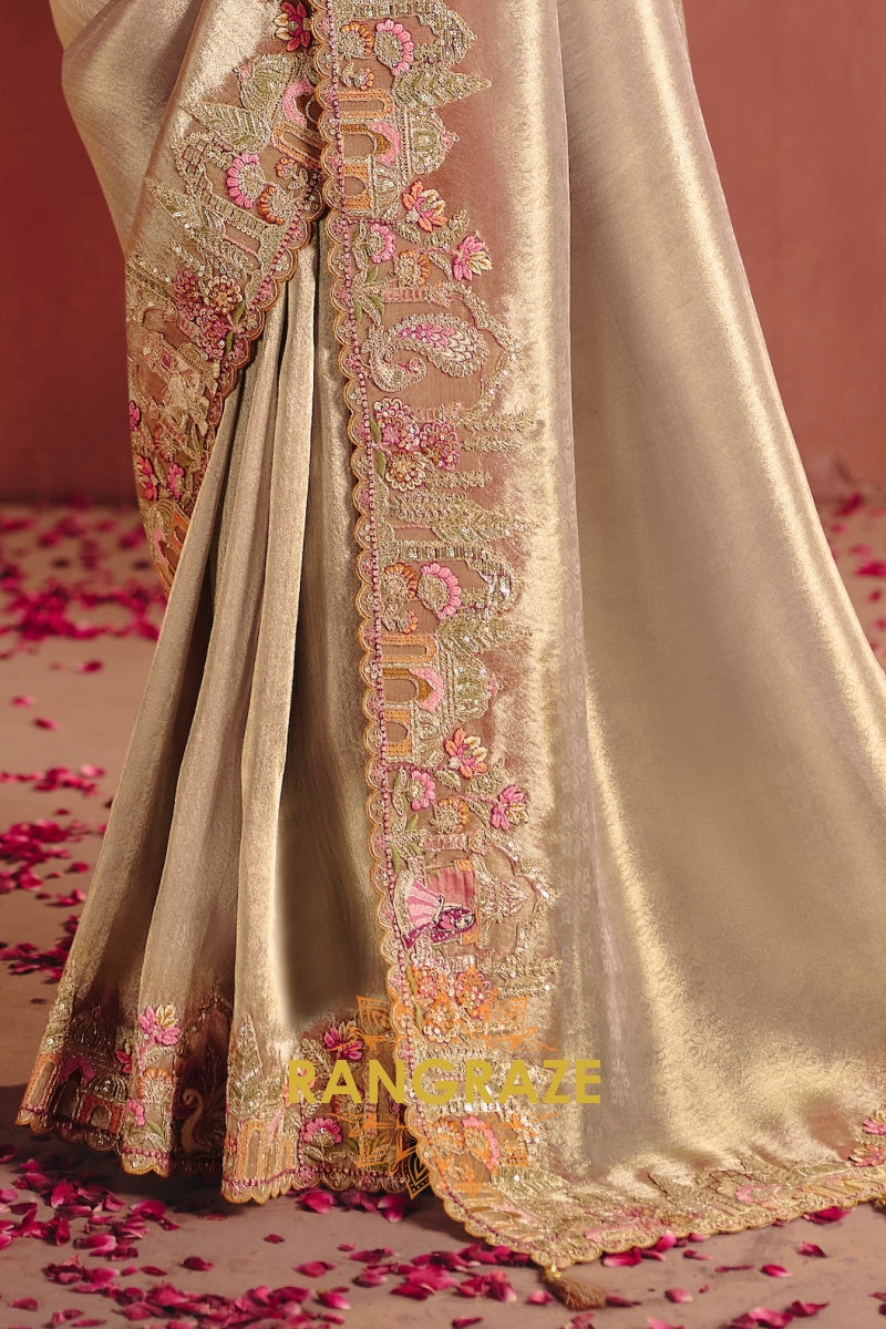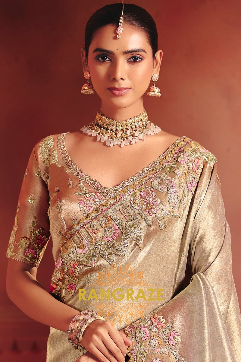 Adorned with heavy embroidery featuring intricate thread work, shimmering sequins, and detailed weaving, the saree showcases beautifully crafted motifs along the border and pallu. The champagne gold tone paired with delicate pastel embroidery enhances its royal charm while maintaining a soft, elegant appeal.