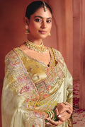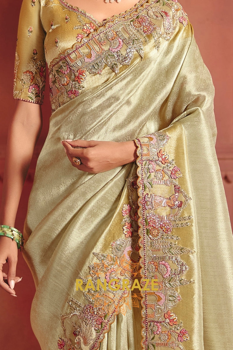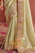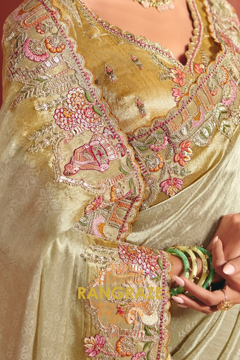 The saree is adorned with heavy embroidery featuring fine thread work, shimmering sequins, and detailed weaving, beautifully highlighted along the border and pallu. The serene ivory-gold tone enhanced with delicate pastel embroidery lends a regal yet graceful charm to the ensemble.