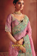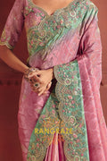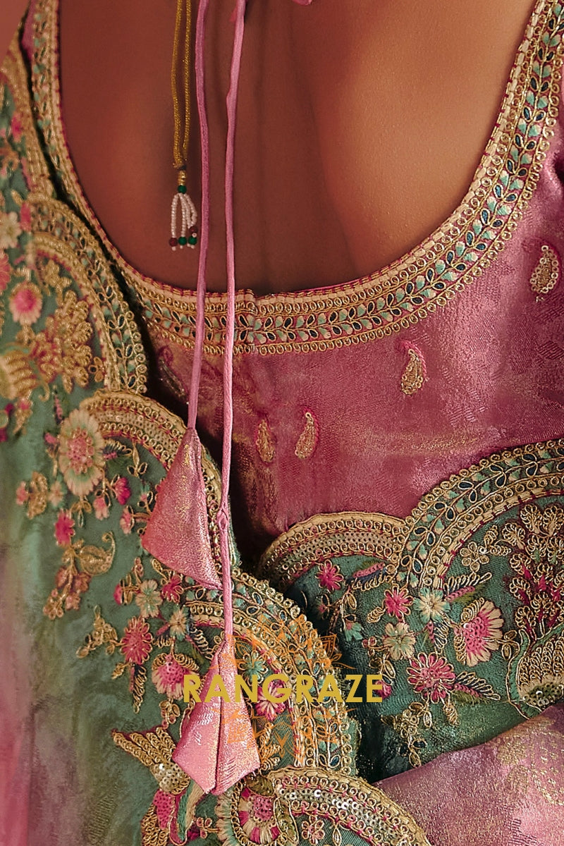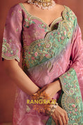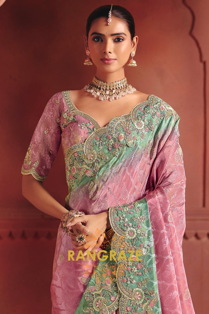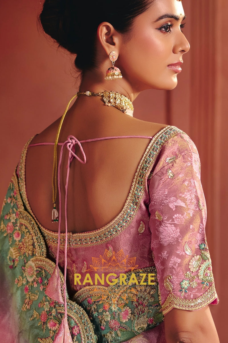 This saree is adorned with heavy embroidery featuring intricate thread work, shimmering sequins, and detailed weaving, beautifully showcased along the border and pallu. The harmonious blend of soft pink and refreshing mint tones creates a charming contrast, adding a refined and festive appeal.