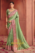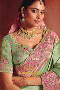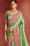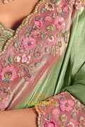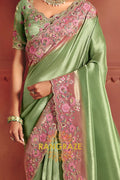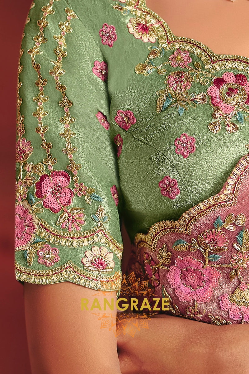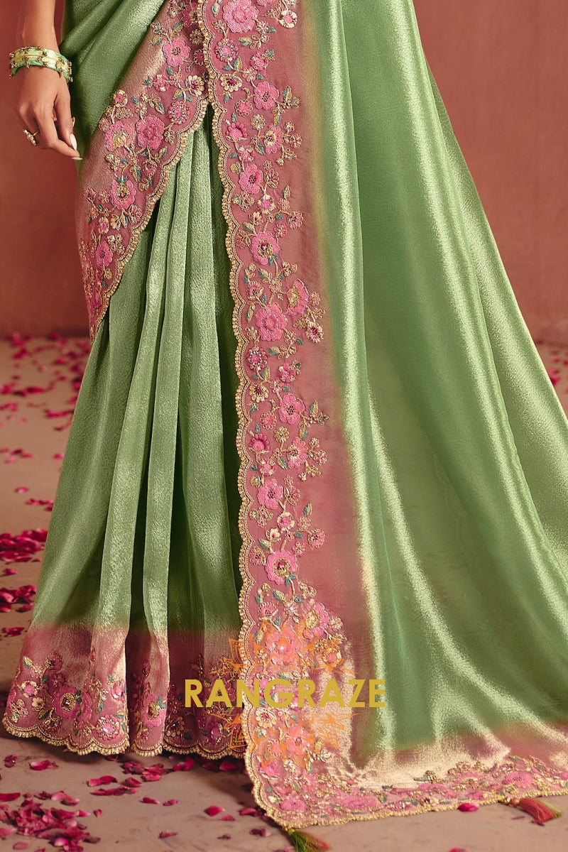 The saree features heavy embroidery enriched with delicate sequins, fine thread work, and detailed weaving, beautifully highlighted along the border and pallu with floral motifs. The refreshing pista green base paired with soft pink embroidery creates a sophisticated contrast, perfect for elegant celebrations.