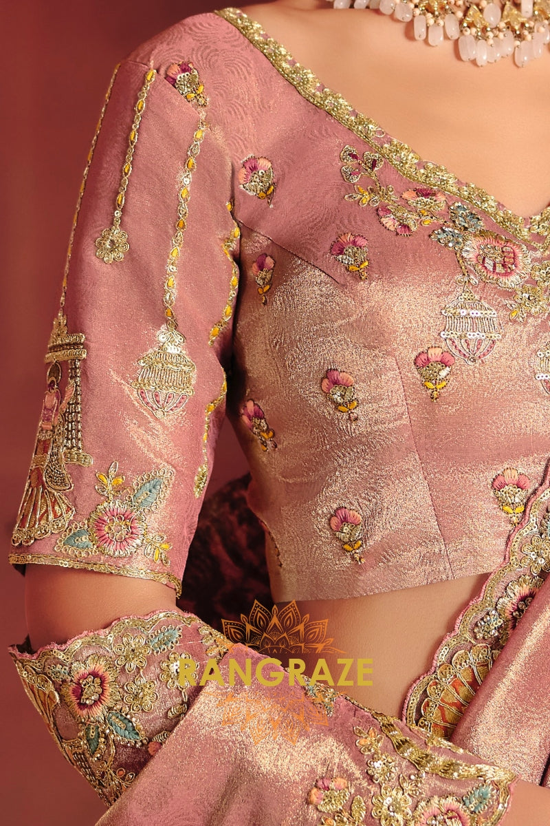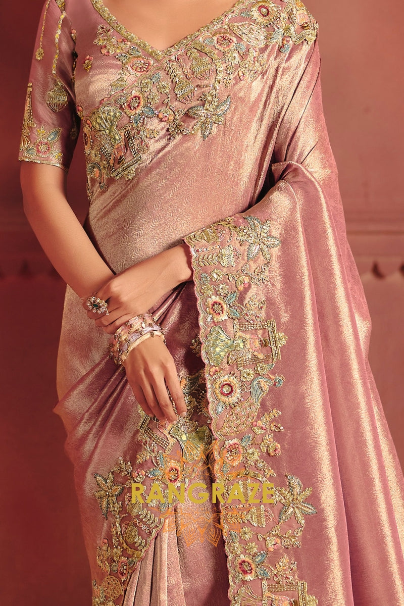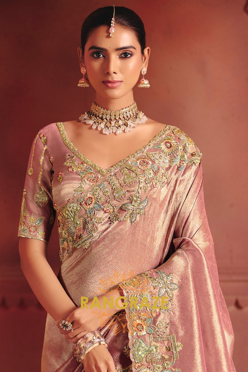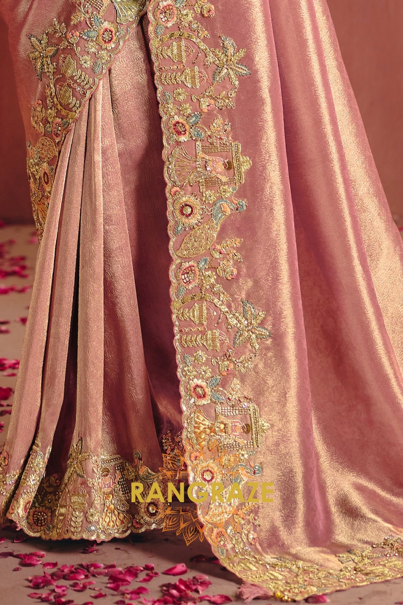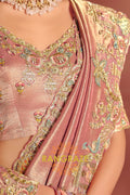 Intricately detailed with heavy embroidery featuring sequins, fine thread work, and woven craftsmanship, the saree showcases beautifully crafted floral motifs along the border and pallu. The delicate shimmer adds depth and sophistication, making it an exquisite choice for weddings and festive events.