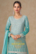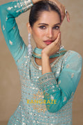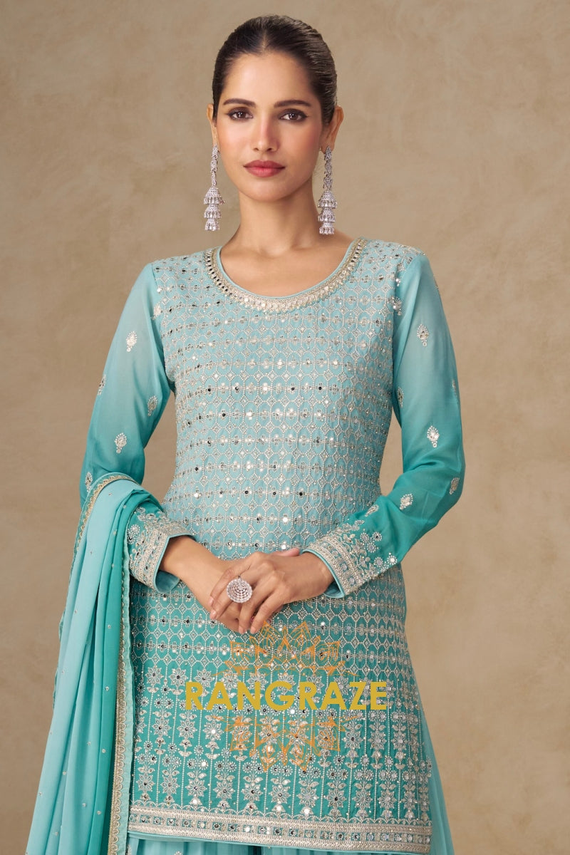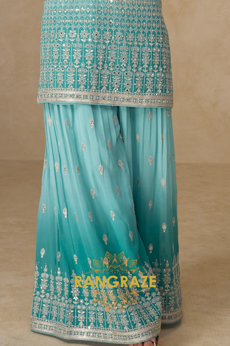 Aqua Mist Pure Georgette Hand Embroidered Sharara Suit Set