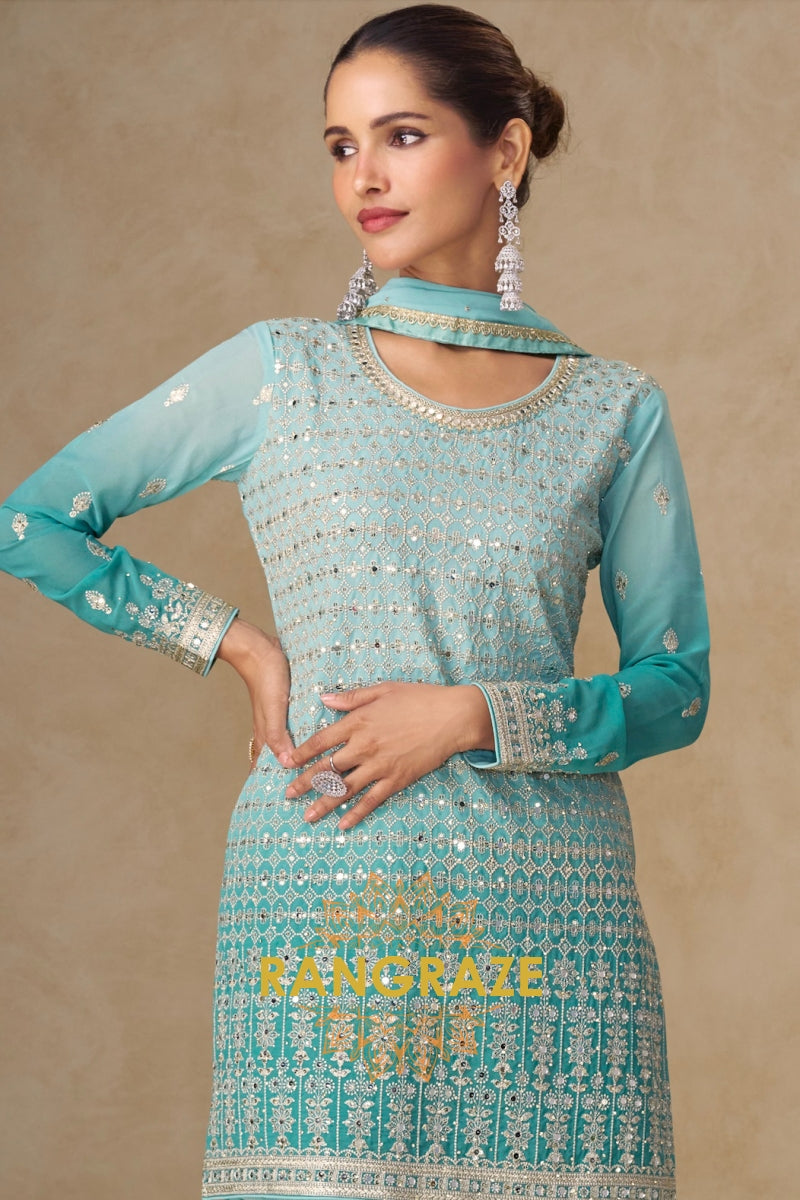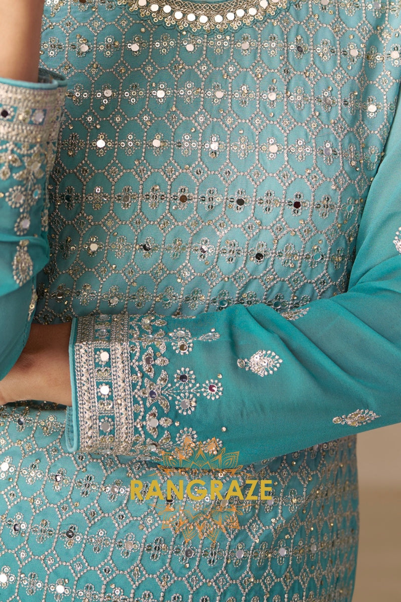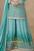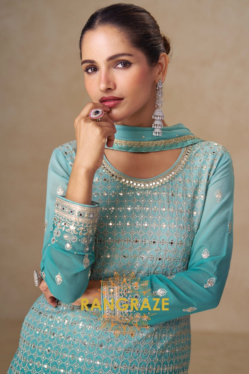 Step into refined elegance with the RangRaze Aqua Mist Pure Georgette Hand Embroidered Sharara Suit Set, a graceful ensemble designed for modern celebrations with a timeless aesthetic. Rendered in a soothing aqua blue tone, this outfit reflects understated luxury and effortless sophistication.