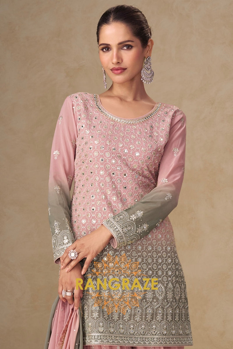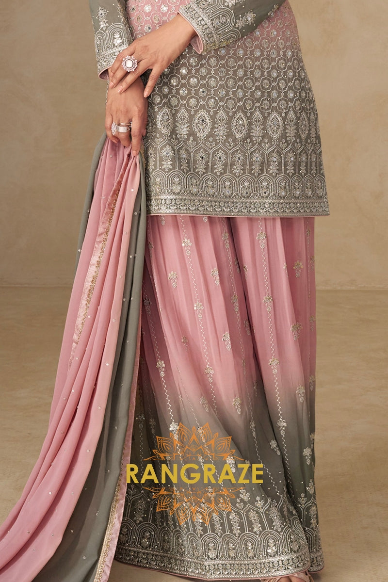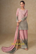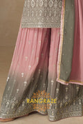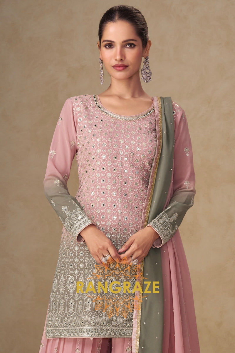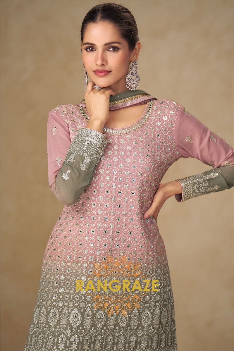 Grace meets refined luxury in the RangRaze Blush Sage Pure Georgette Hand Embroidered Sharara Suit Set, an exquisite ensemble crafted for elegant wedding occasions and sophisticated festive gatherings. Designed in a harmonious blend of soft blush pink and muted sage green, this suit embodies timeless charm with a modern regal appeal.