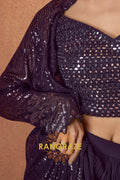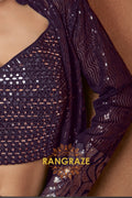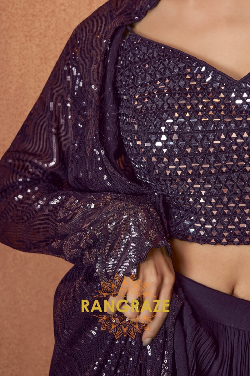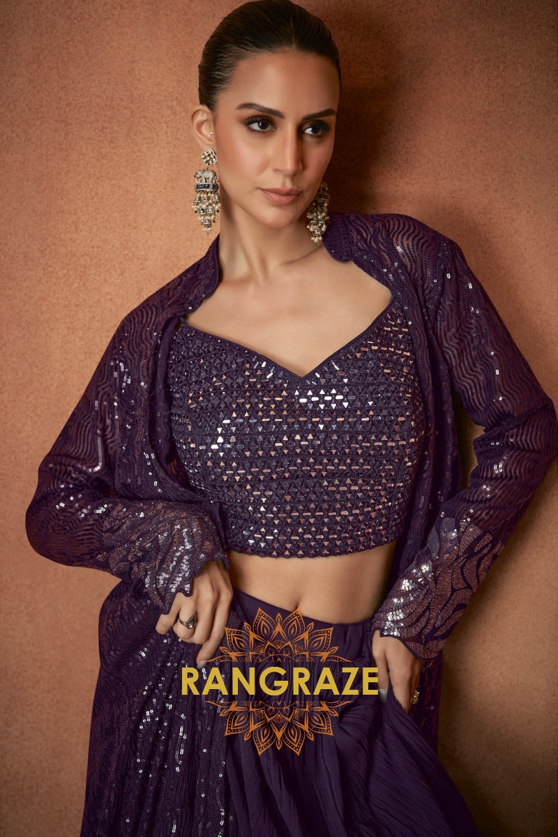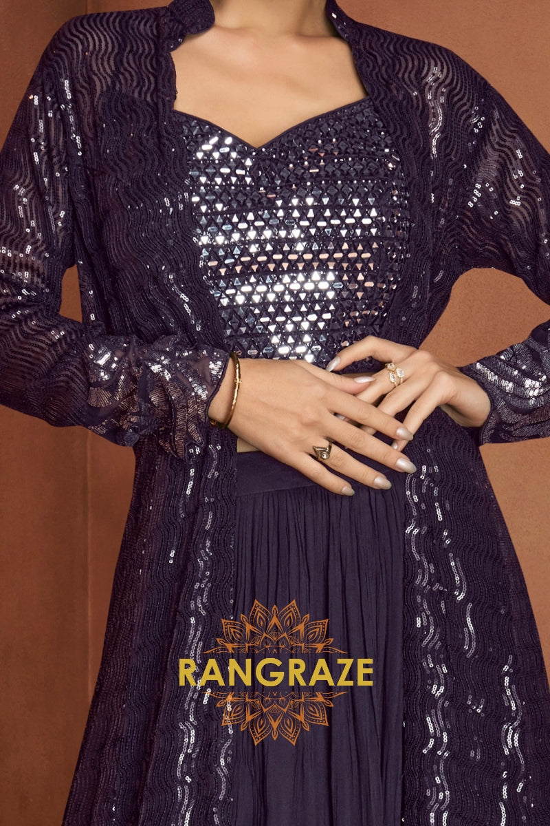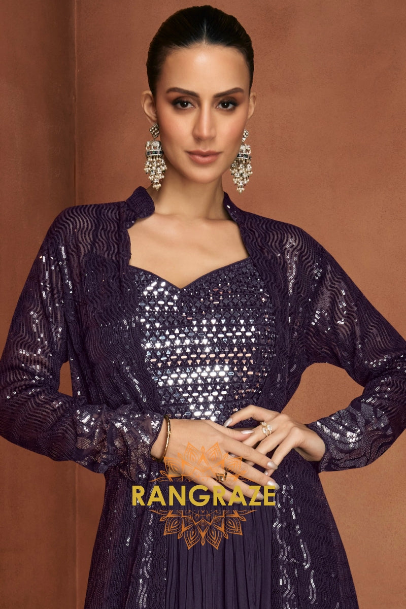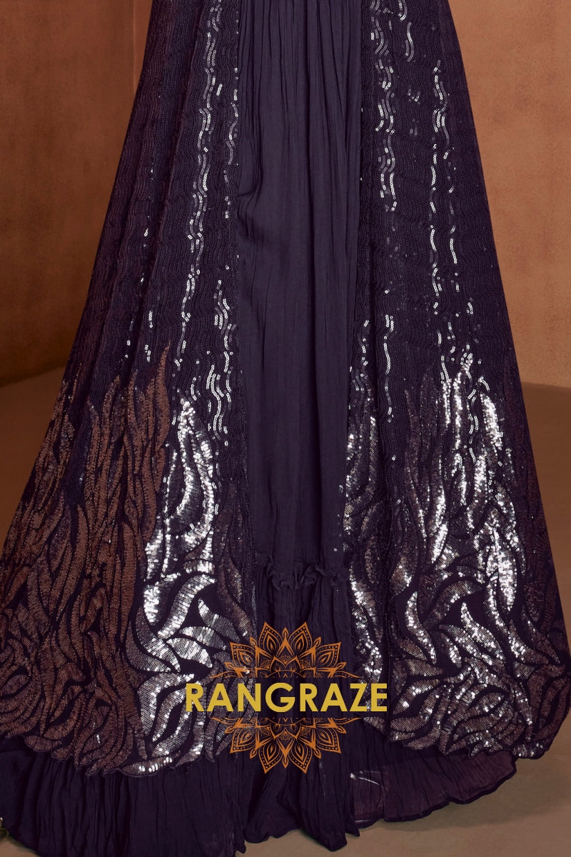 The outfit showcases an intricately embellished bodice paired with a dramatically flared Anarkali-style gown, creating a graceful and regal appearance. The rich deep purple tone enhances the reflective sequin work, giving the ensemble a sophisticated designer finish. Lightweight and fluid, the premium chinon fabric ensures comfort while maintaining an elegant drape.