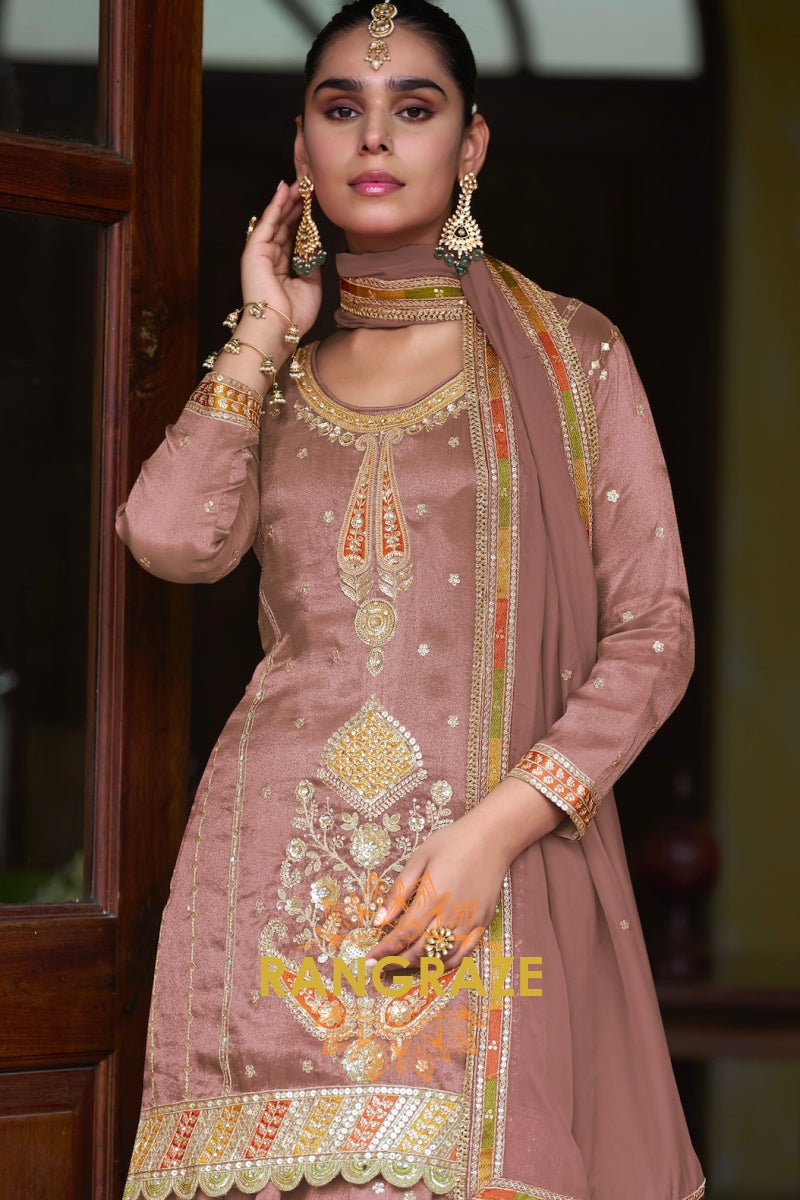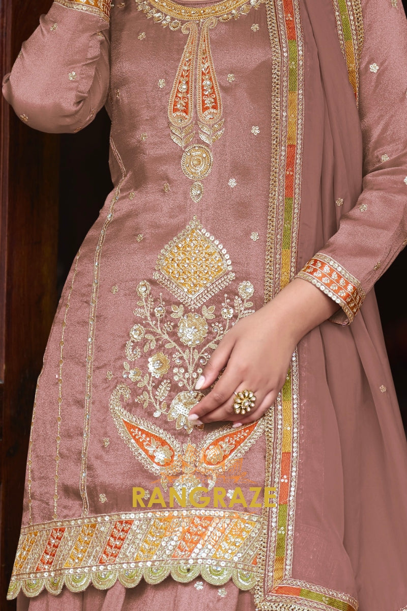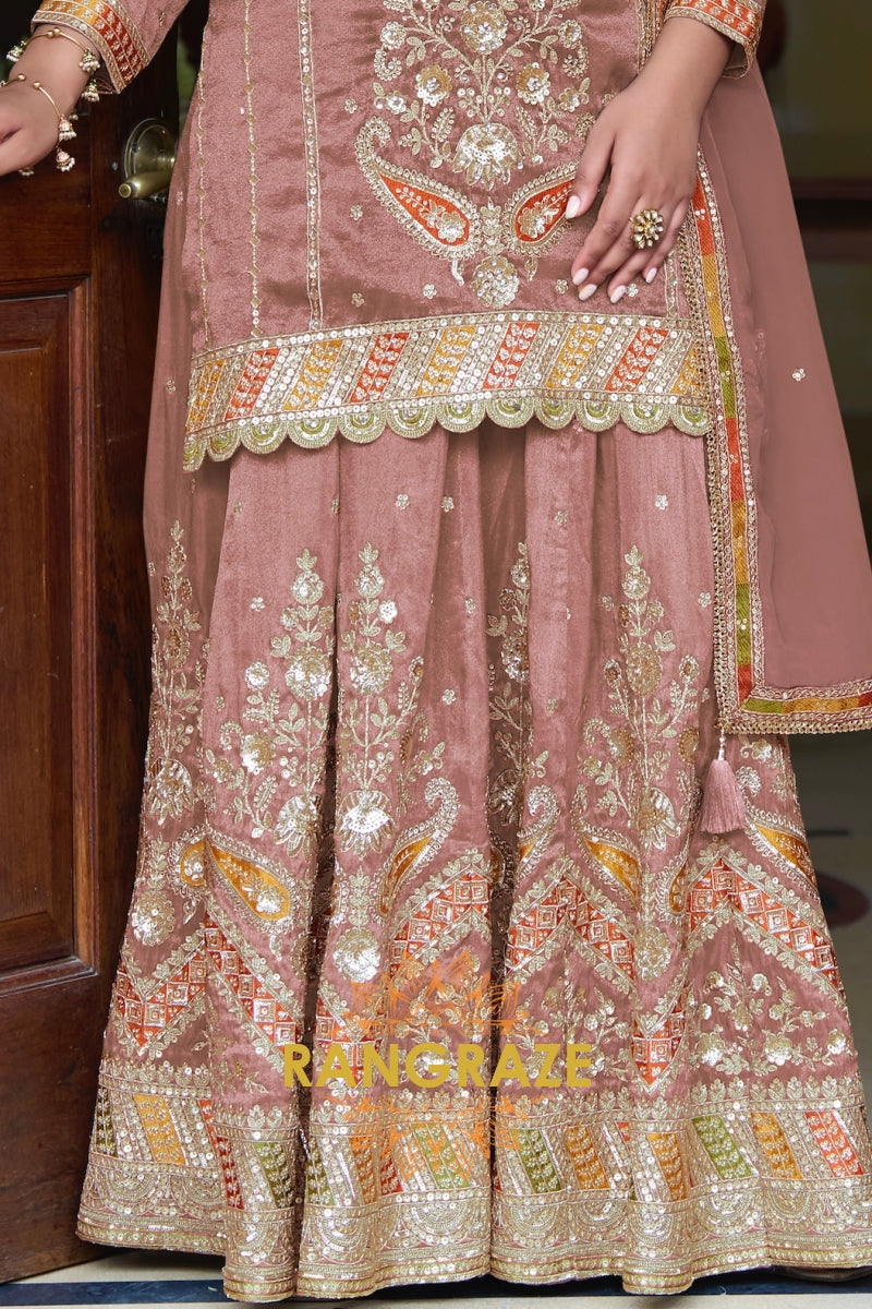 Step into understated luxury with the RangRaze Gul-E-Shaam Fine Shimmer Silk Embroidered Sharara Suit Set, an exquisite ensemble crafted for weddings, festive evenings, and elegant celebrations. Designed in a soft dusty rose hue, this sharara suit radiates timeless grace with a refined royal appeal.