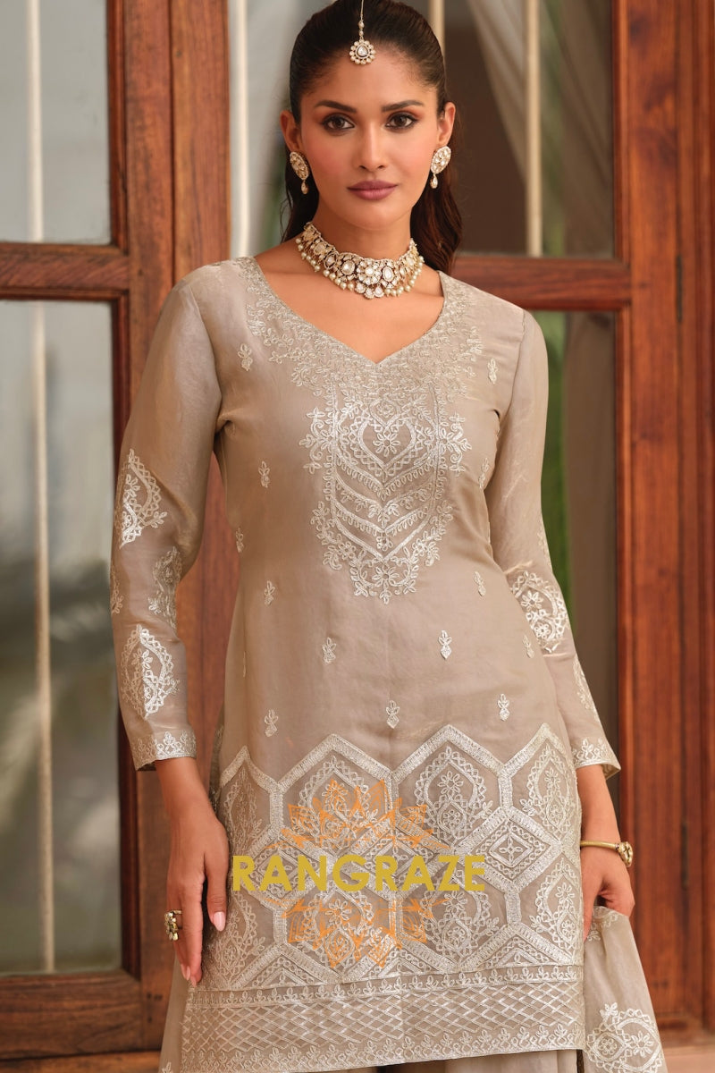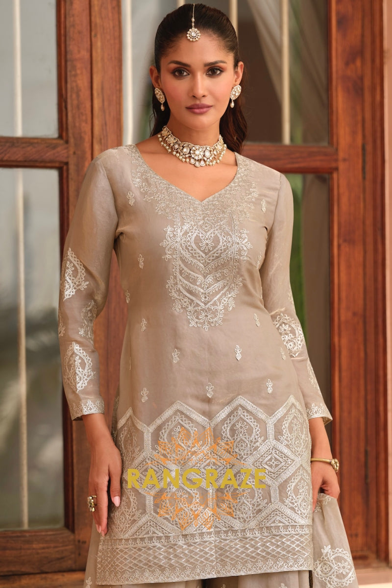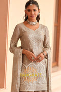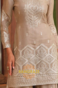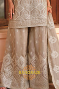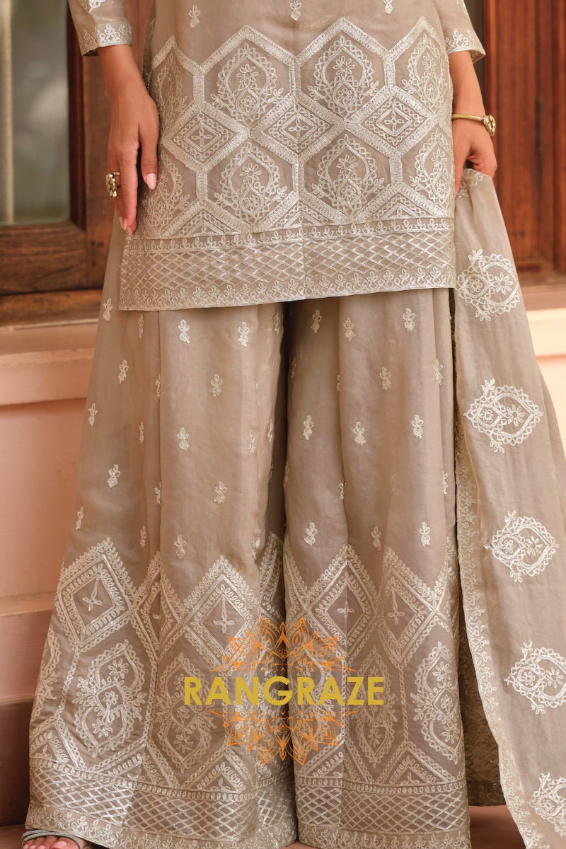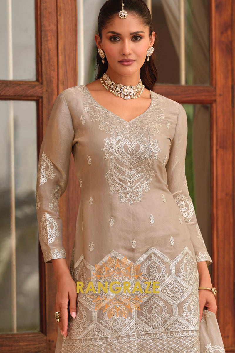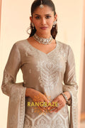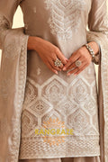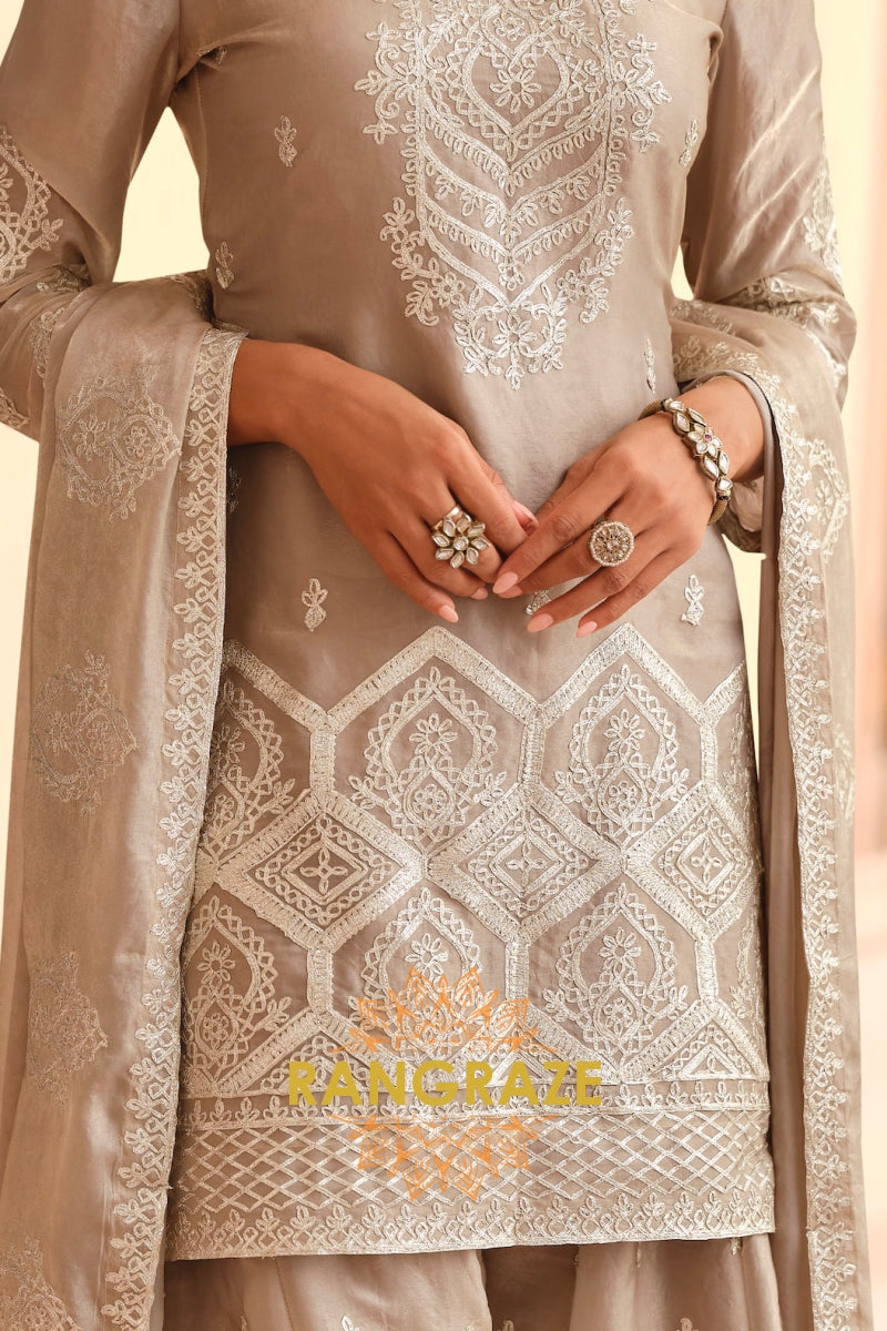 Grace meets grandeur in the RangRaze Ivory Mist Premium Silk Sharara Suit Set, a sophisticated ensemble designed for elegant wedding functions and refined festive occasions. Rendered in a serene ivory-beige tone, this sharara suit reflects understated luxury with timeless appeal.