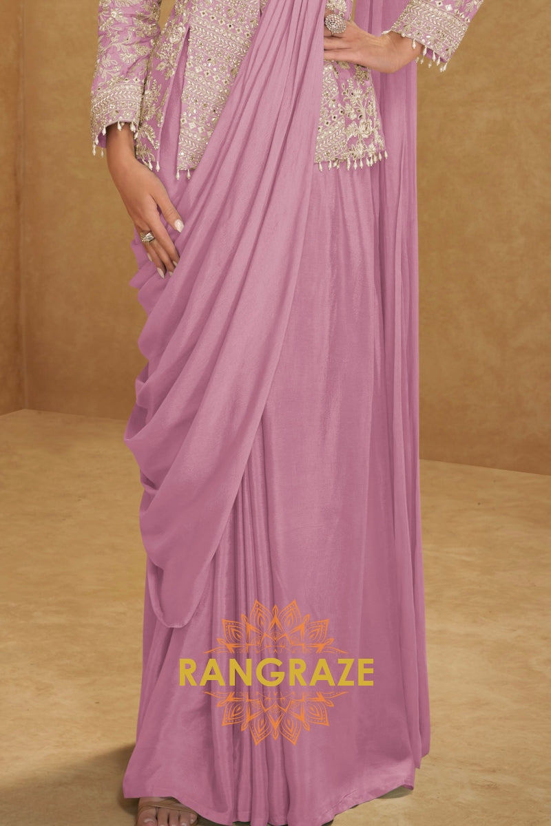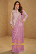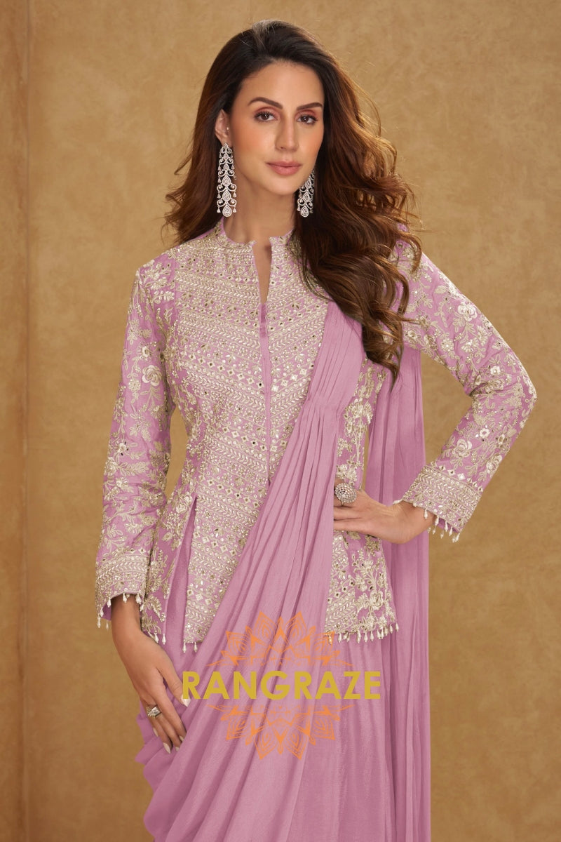 Pair this lilac saree style suit with diamond or pearl drop earrings for an elegant finish. Opt for soft pink or mauve makeup with luminous skin and style your hair in loose waves or a sleek low bun. Complete the look with metallic heels or delicate embroidered juttis.
