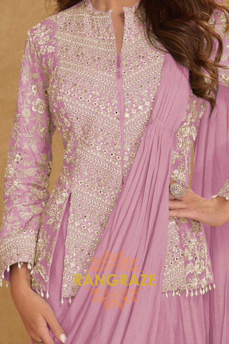 Soft, graceful, and exquisitely detailed, the RangRaze Lilac Serene Pure Georgette Saree Style Suit Set is designed for the modern woman who appreciates refined elegance. Rendered in a delicate lilac hue, this ensemble beautifully blends traditional craftsmanship with contemporary styling.