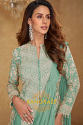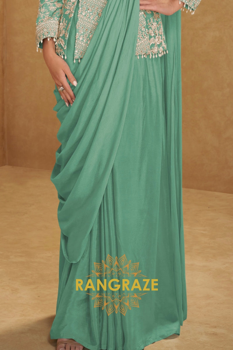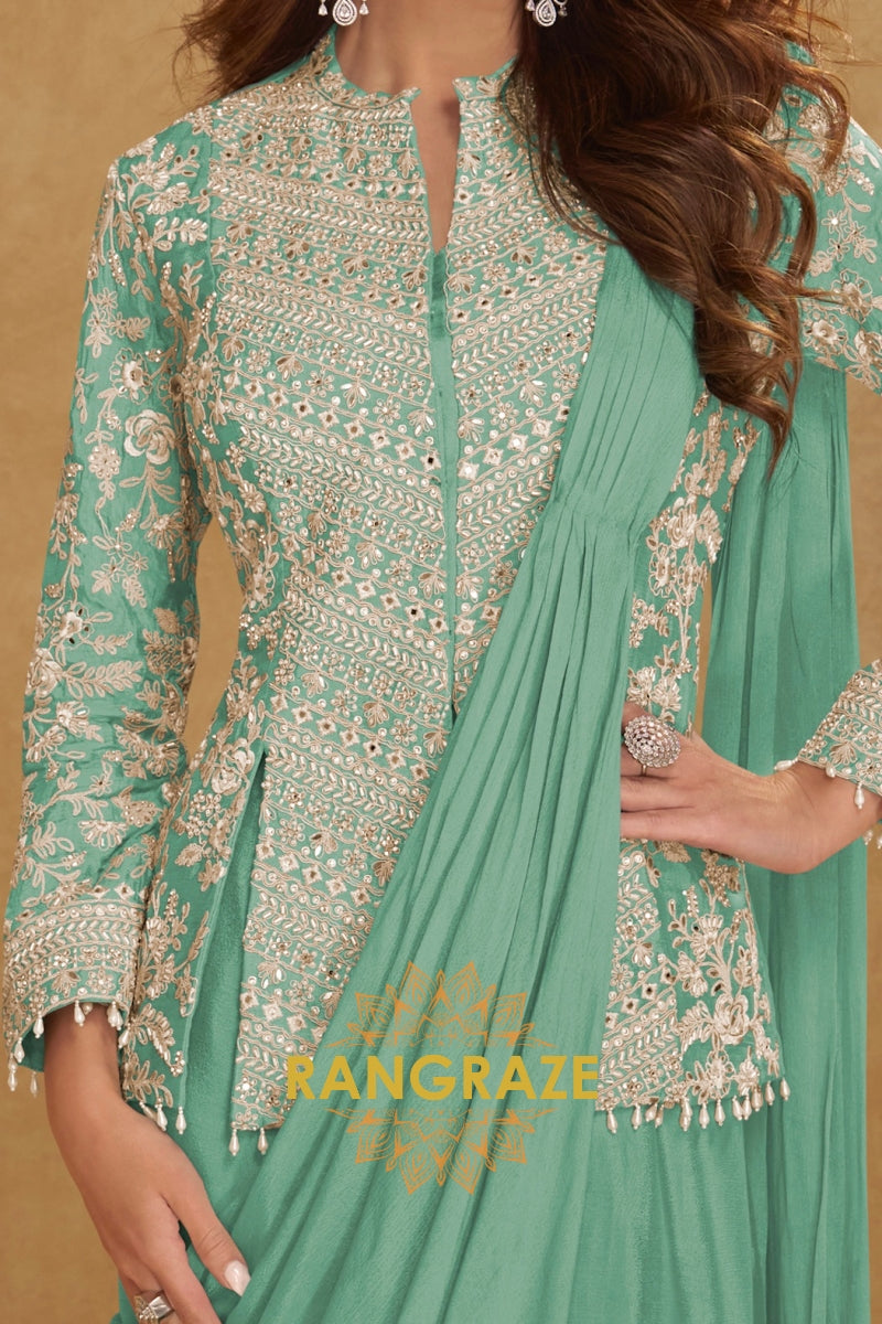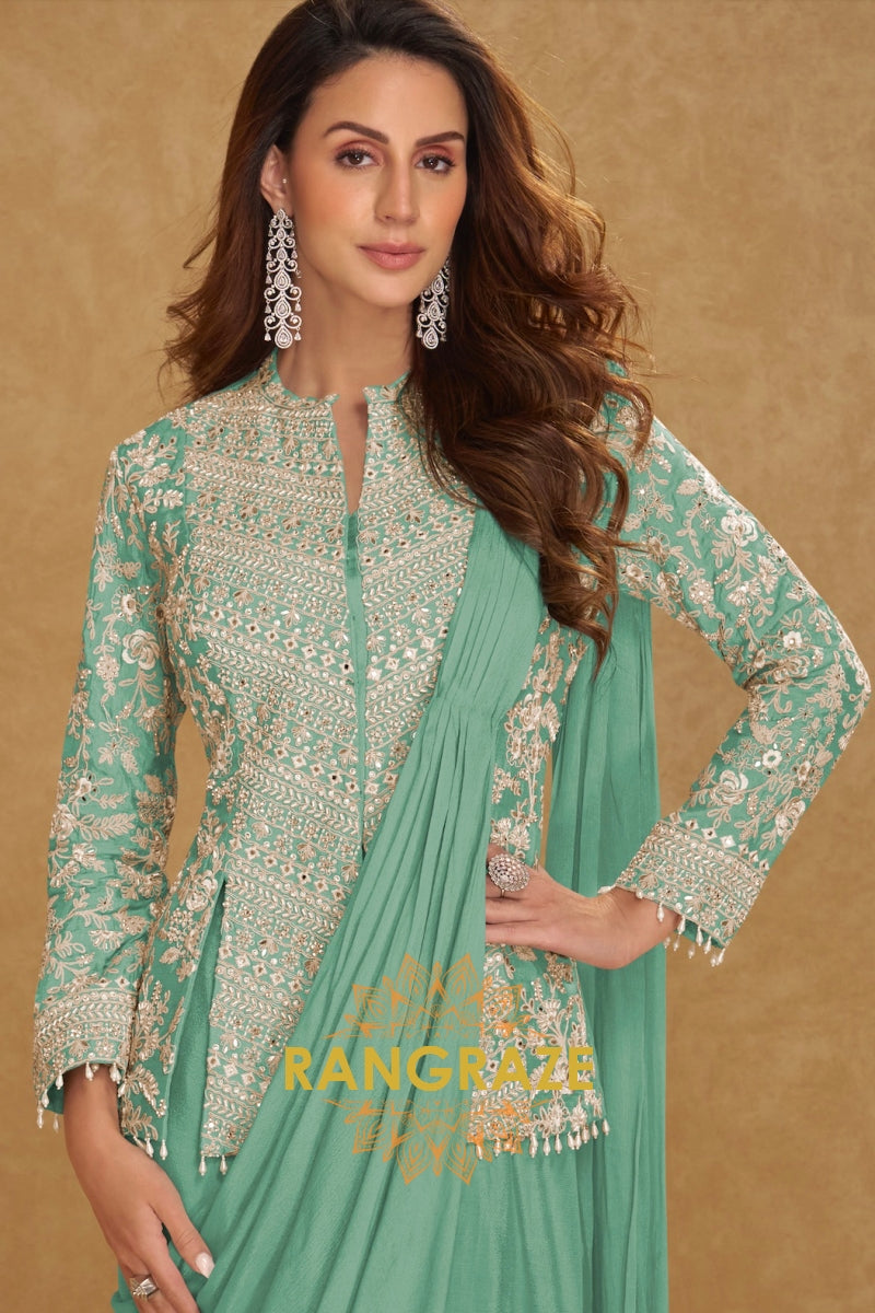 Effortlessly elegant and exquisitely crafted, the RangRaze Mint Aura Pure Georgette Saree Style Suit Set is a refined expression of contemporary Indian couture. Designed in a soothing mint green hue, this ensemble offers the graceful allure of a saree combined with the ease and structure of a modern suit silhouette.