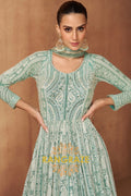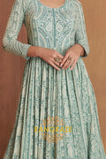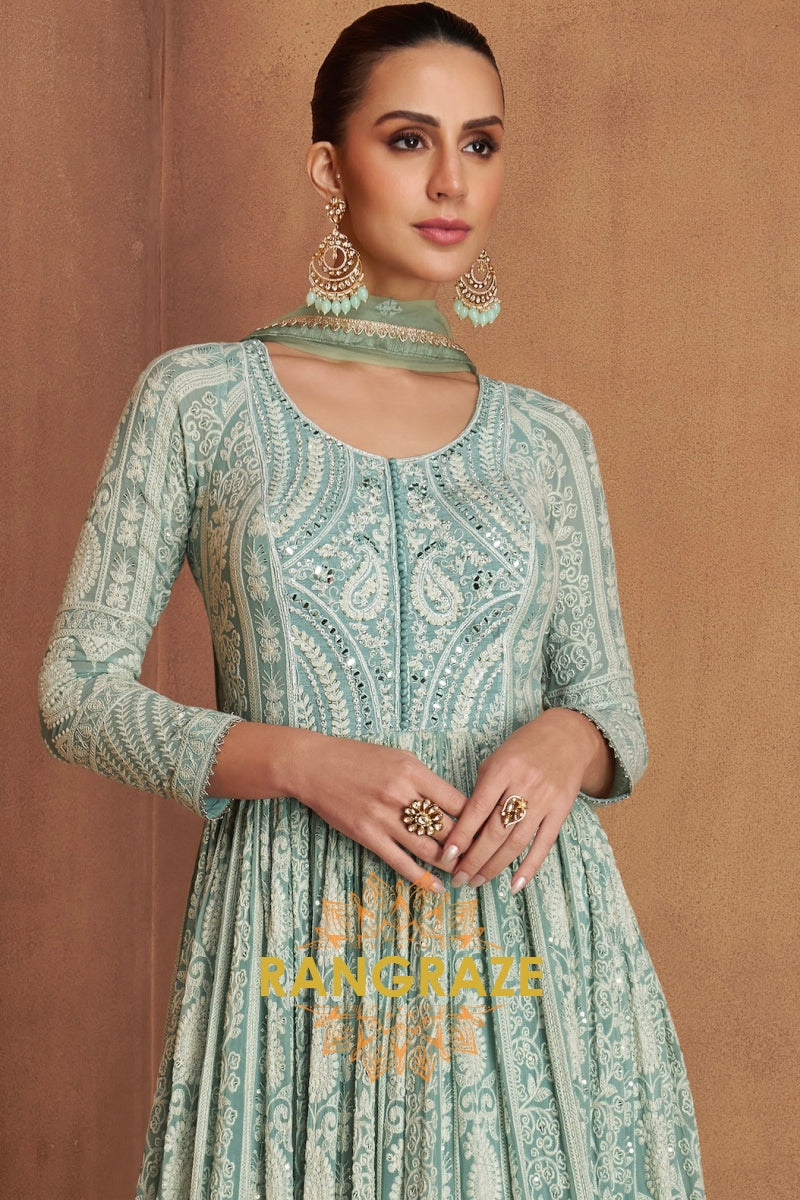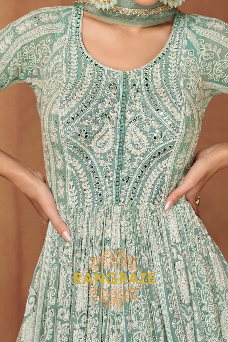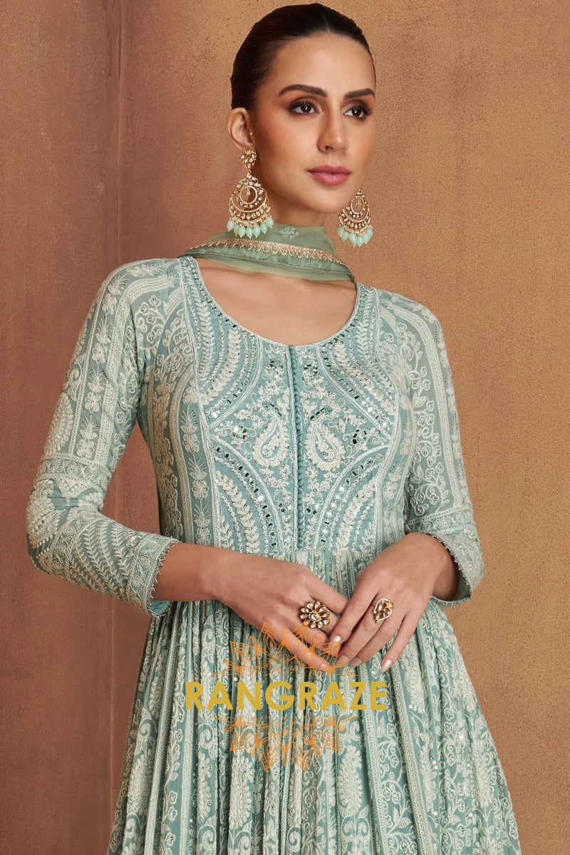 Exude effortless elegance with the RangRaze Aab-E-Zeest Georgette Mirror Work Embroidered Anarkali Suit Set, a graceful ensemble designed for festive occasions and daytime celebrations. Rendered in a soothing mint green hue, this Anarkali suit beautifully blends delicate craftsmanship with timeless charm.