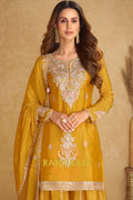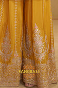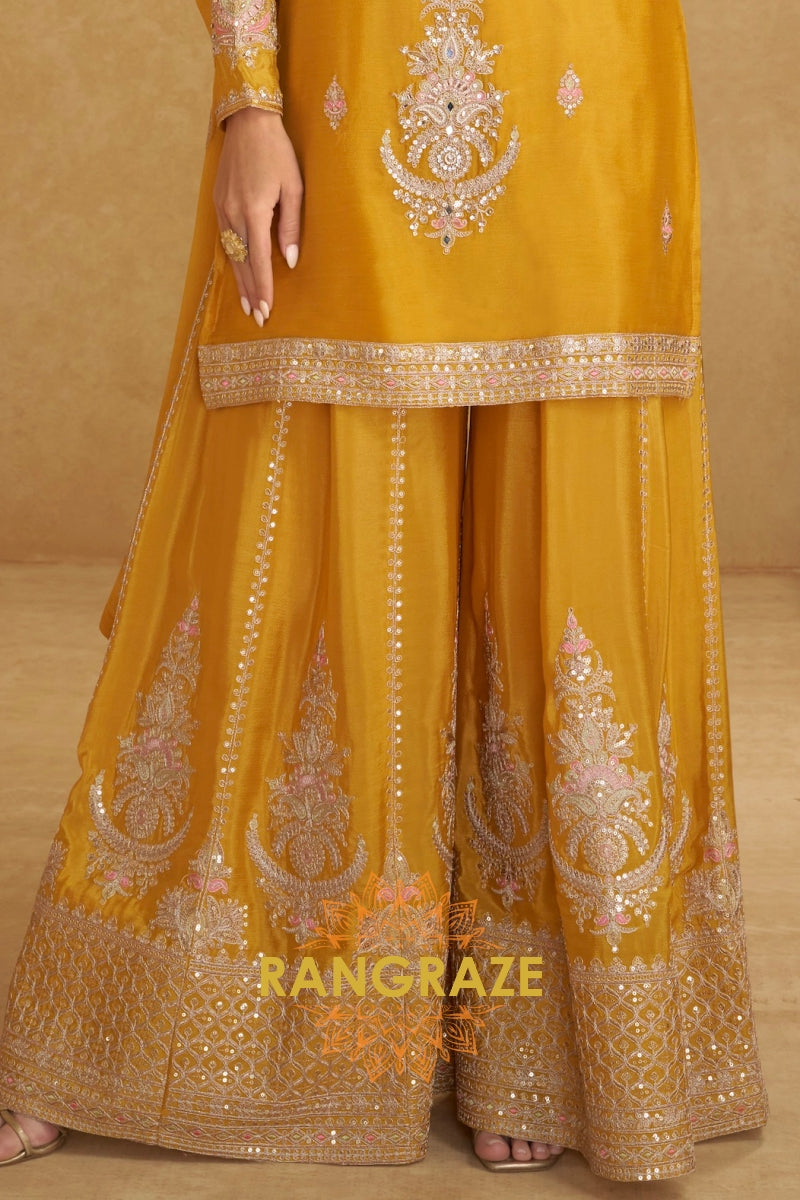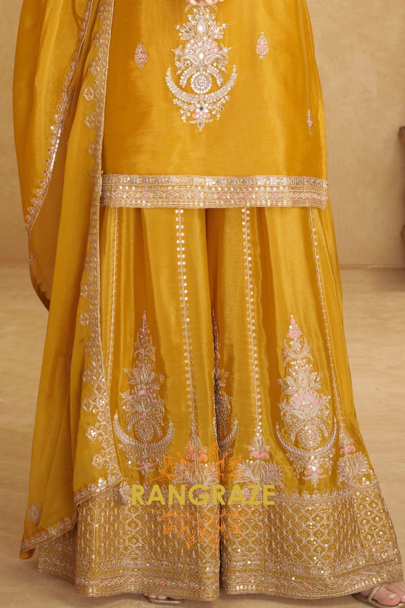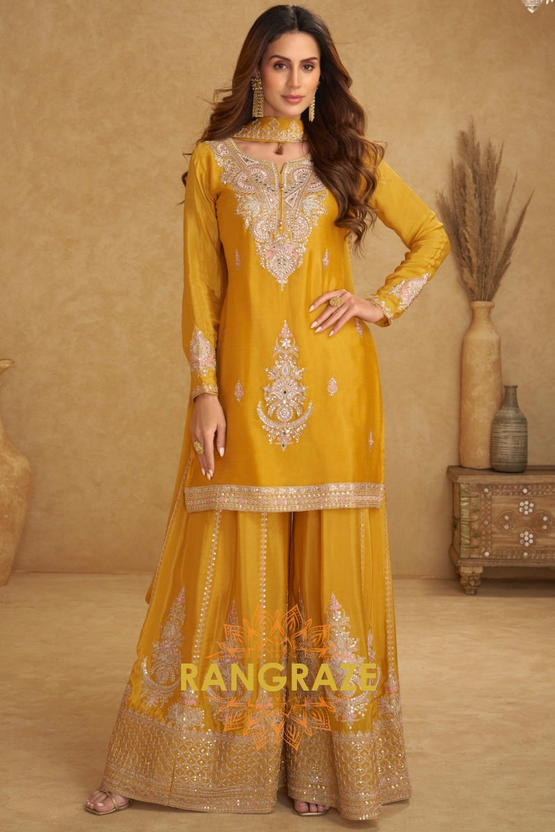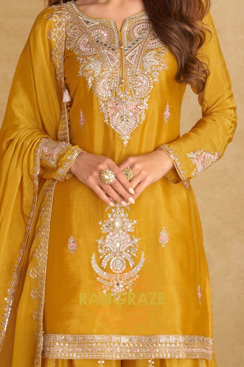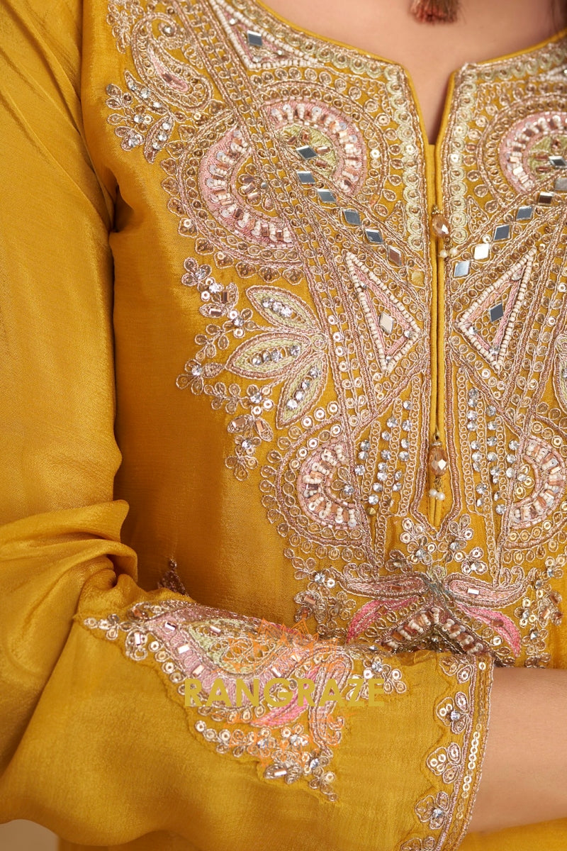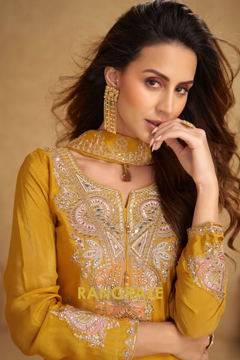 Radiating warmth, elegance, and festive charm, the RangRaze Mustard Gold Pure Chinnon Suit Set is a statement ensemble crafted for sophisticated celebrations. The rich mustard hue paired with intricate hand embroidery brings together traditional artistry and contemporary refinement.