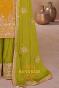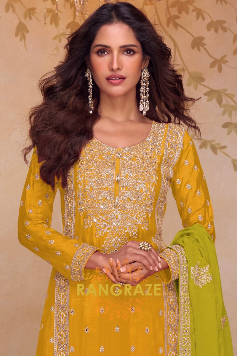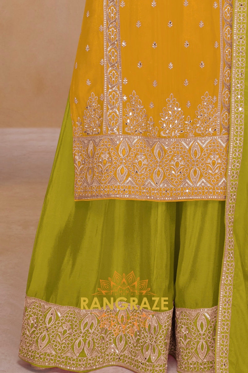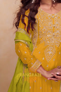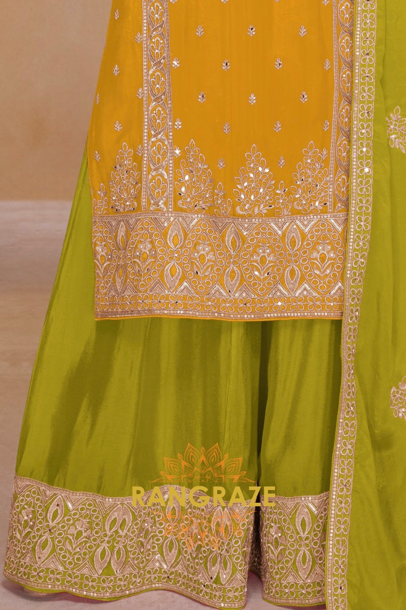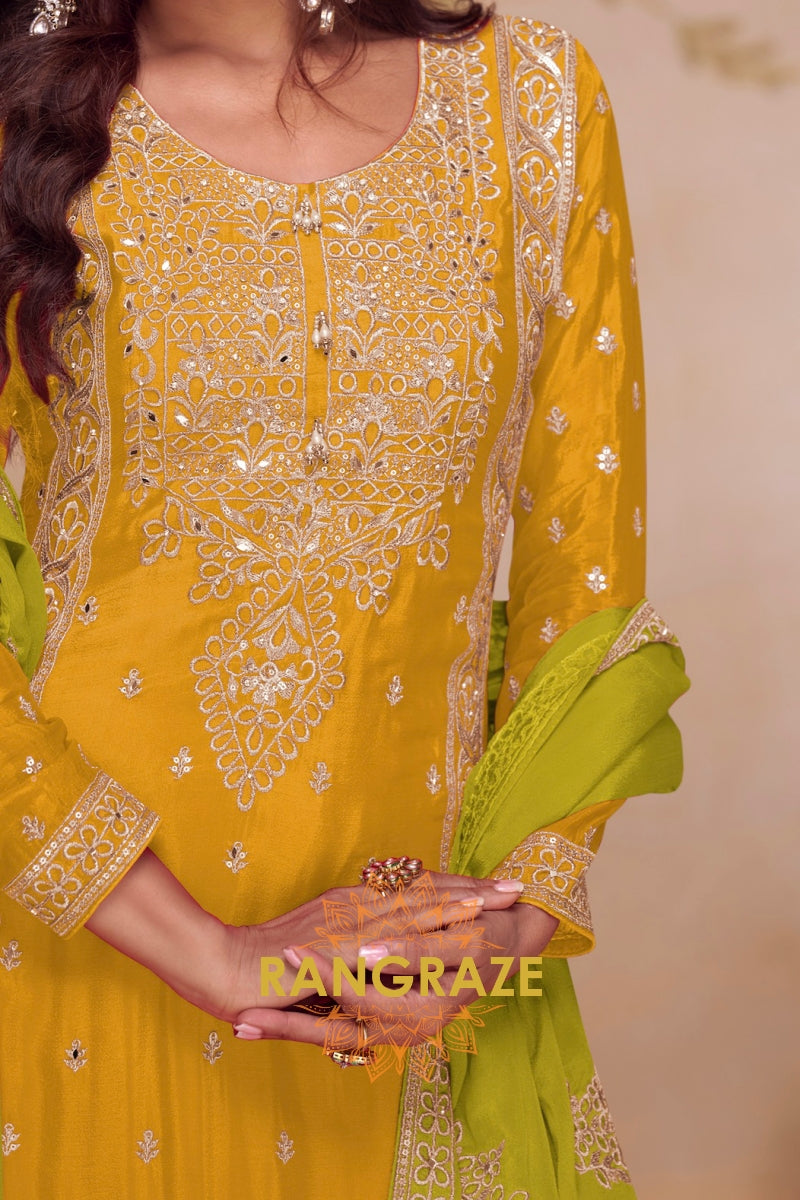 Bright, graceful, and rooted in artisanal elegance, the RangRaze Mustard & Lime Pure Chinnon Suit Set is designed to make a refined festive statement. The warm mustard kurta paired with a refreshing lime green base and dupatta creates a striking yet balanced colour palette.