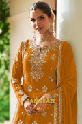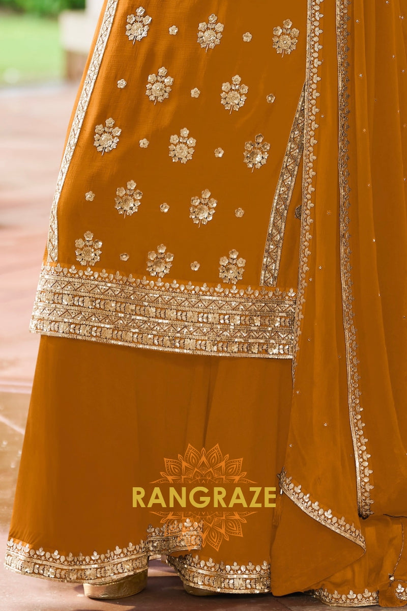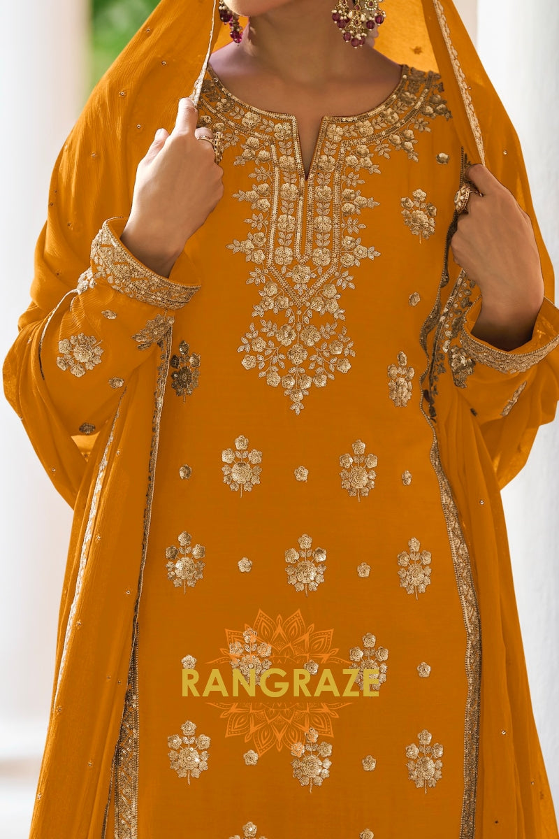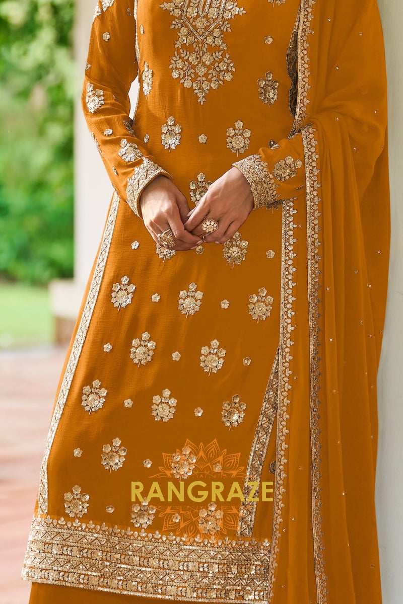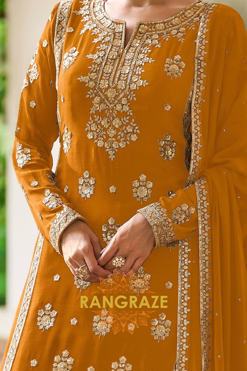Radiate festive elegance with this stunning Mustard Premium Chinon Designer Suit Set from RangRaze. Crafted from luxurious premium chinon fabric, this ensemble offers a graceful drape and lightweight comfort, making it perfect for celebratory occasions. The rich mustard hue is beautifully enhanced with intricate golden embroidery, creating a striking and sophisticated ethnic look.