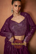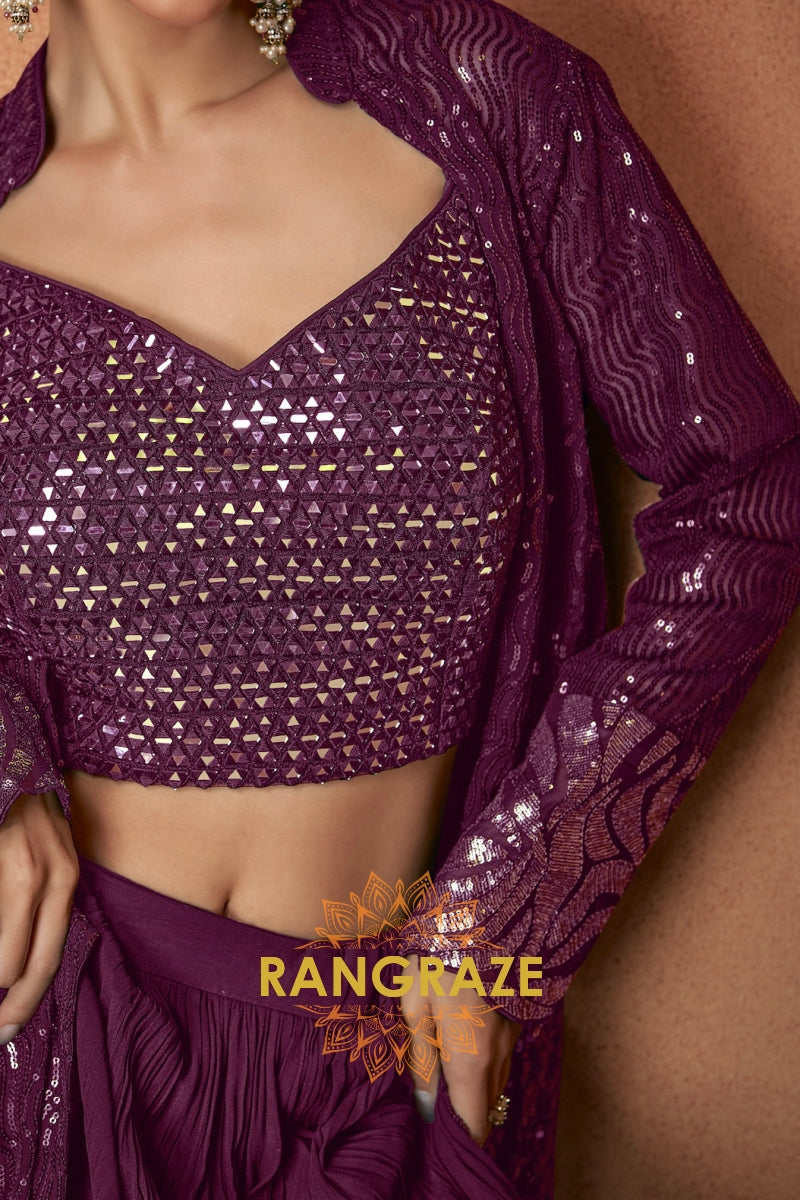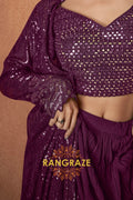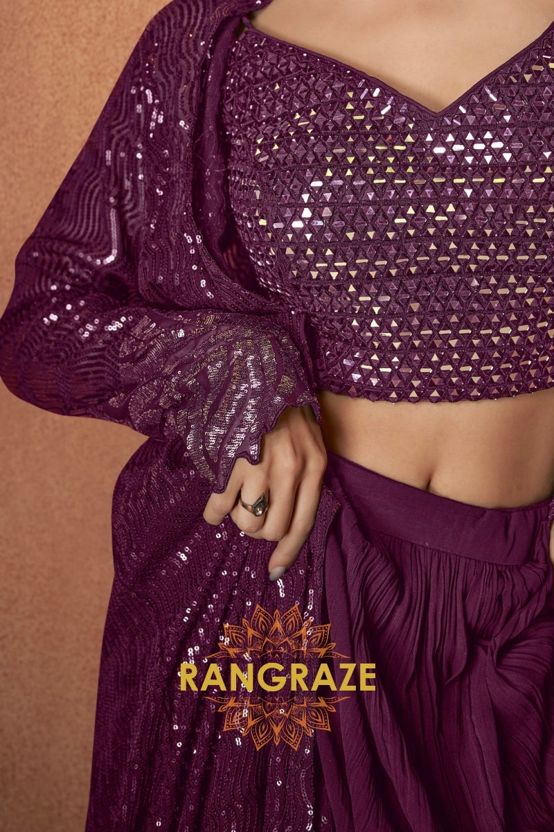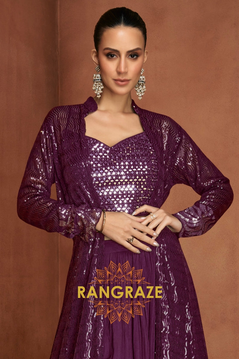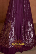 The outfit showcases a structured embellished bodice paired with a dramatically flared Anarkali-style gown that adds graceful movement and elegance. The rich plum shade enhances the intricate sequin work, giving the ensemble a regal and festive appeal. The lightweight and fluid nature of premium chinon ensures comfort while maintaining a stunning drape.