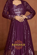 Exude elegance and glamour with this Plum Premium Chinon Designer Anarkali Set from RangRaze. Crafted from luxurious premium chinon fabric, this ensemble features a beautifully flowing silhouette enhanced with shimmering sequin detailing that creates a sophisticated designer look.