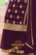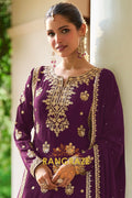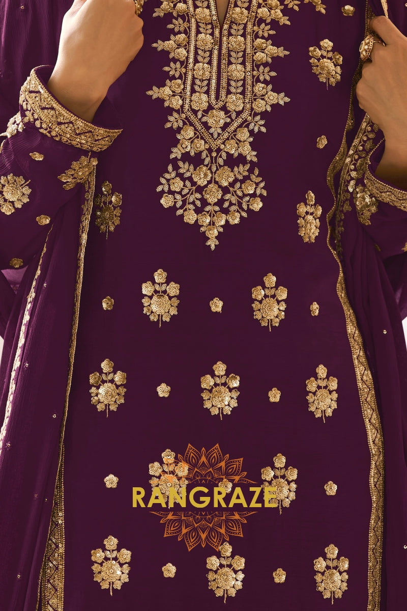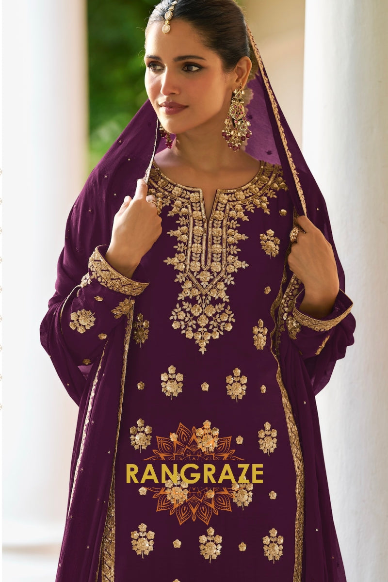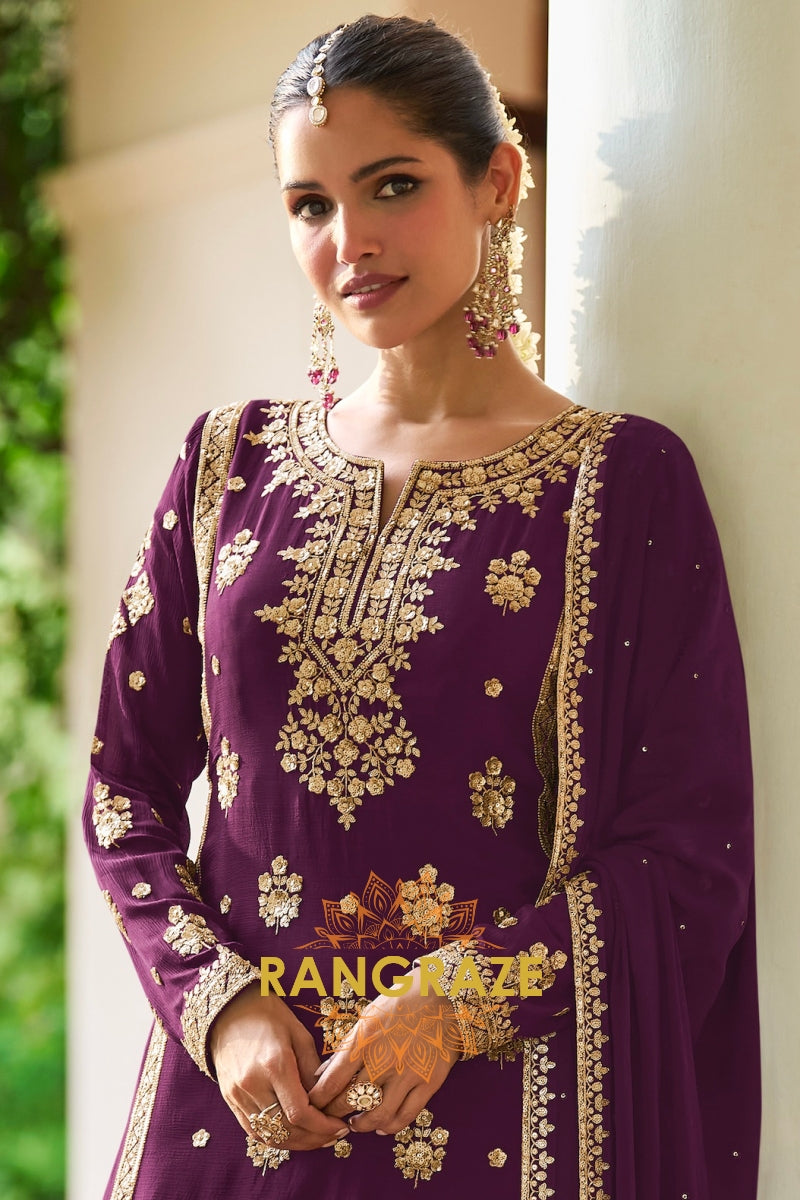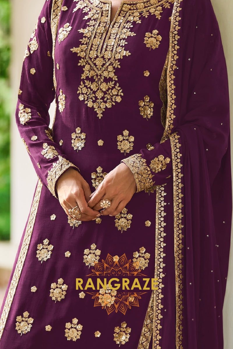 Add a touch of regal elegance to your festive wardrobe with this Plum Premium Chinon Designer Suit Set from RangRaze. Crafted from luxurious premium chinon fabric, this outfit offers a graceful drape and lightweight comfort while maintaining a rich and sophisticated appearance. The deep plum shade paired with intricate golden embroidery creates a timeless festive ensemble.